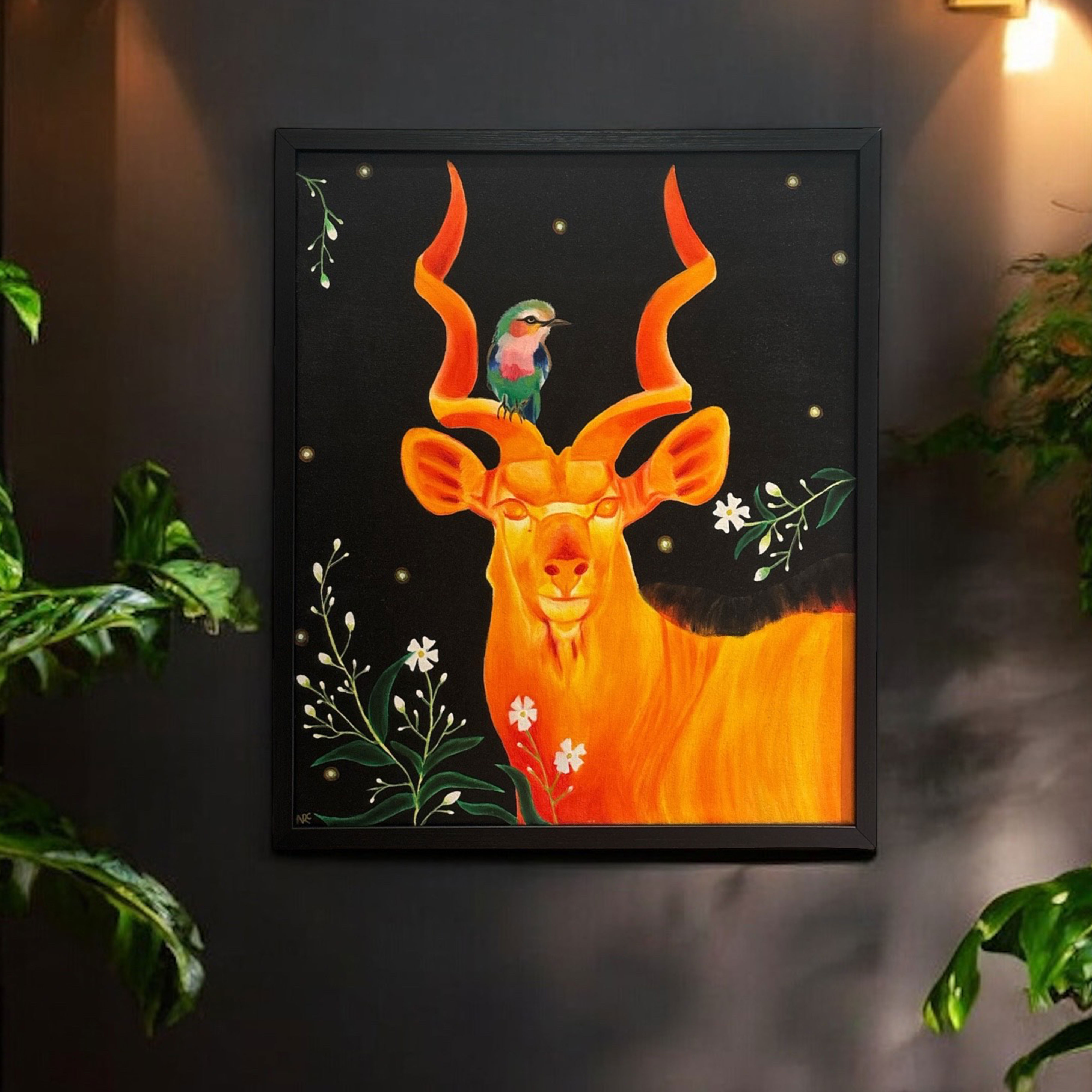 Oil painting of an African spiral-horned antelope with a Lilac breasted roller resting on one of the horns surrounded by fireflies and fauna.