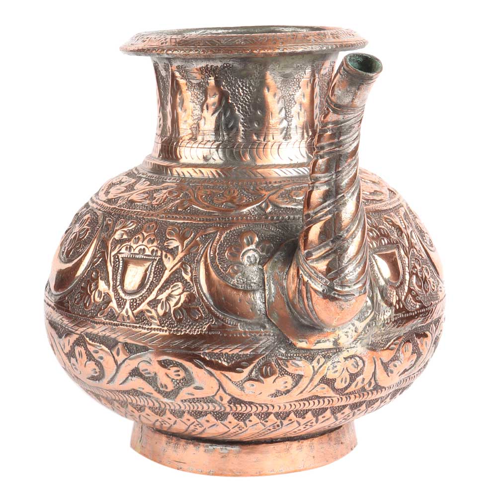 Embossed Floral Design Copper Water Pot With Stout, the design covering almost every area of the pot including the stout, but excepting the foot. The design is similar to indo Persian design with lots of flowers and leaves . Wedding gift, Christmas gift and ideal collectors item.
