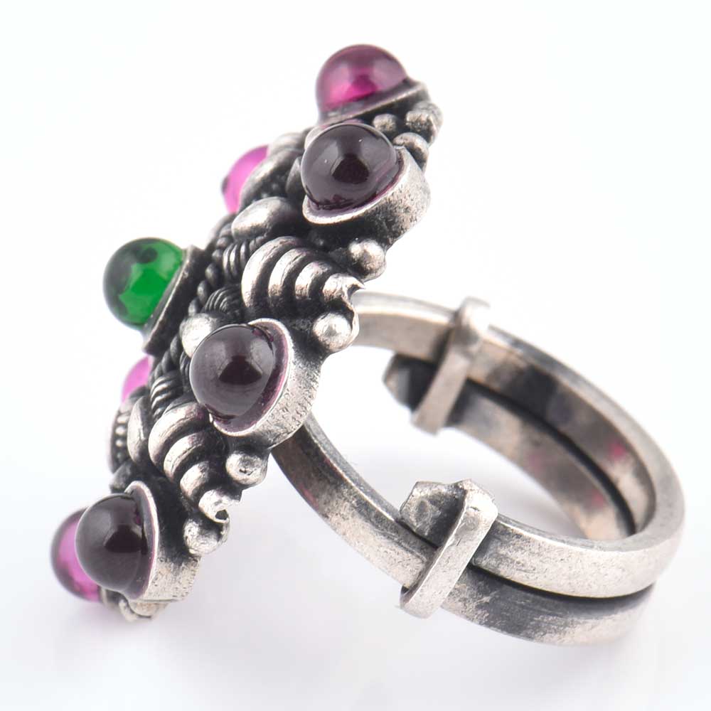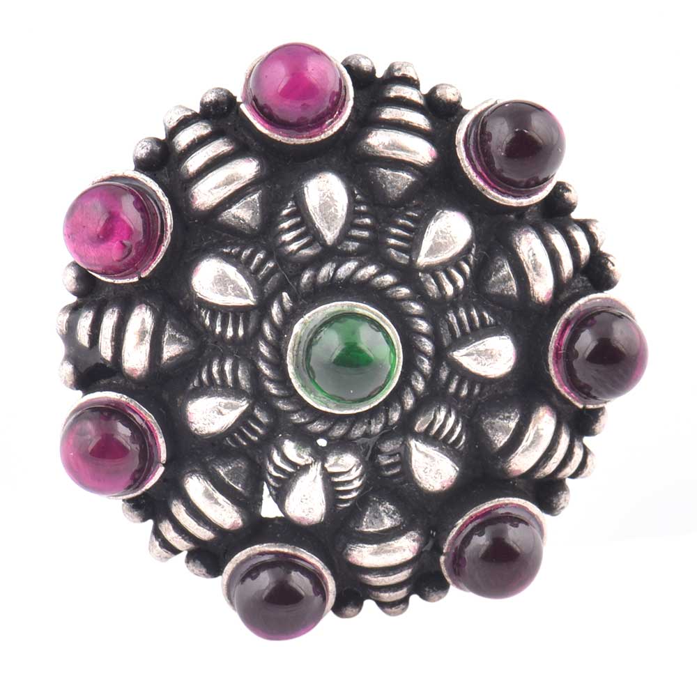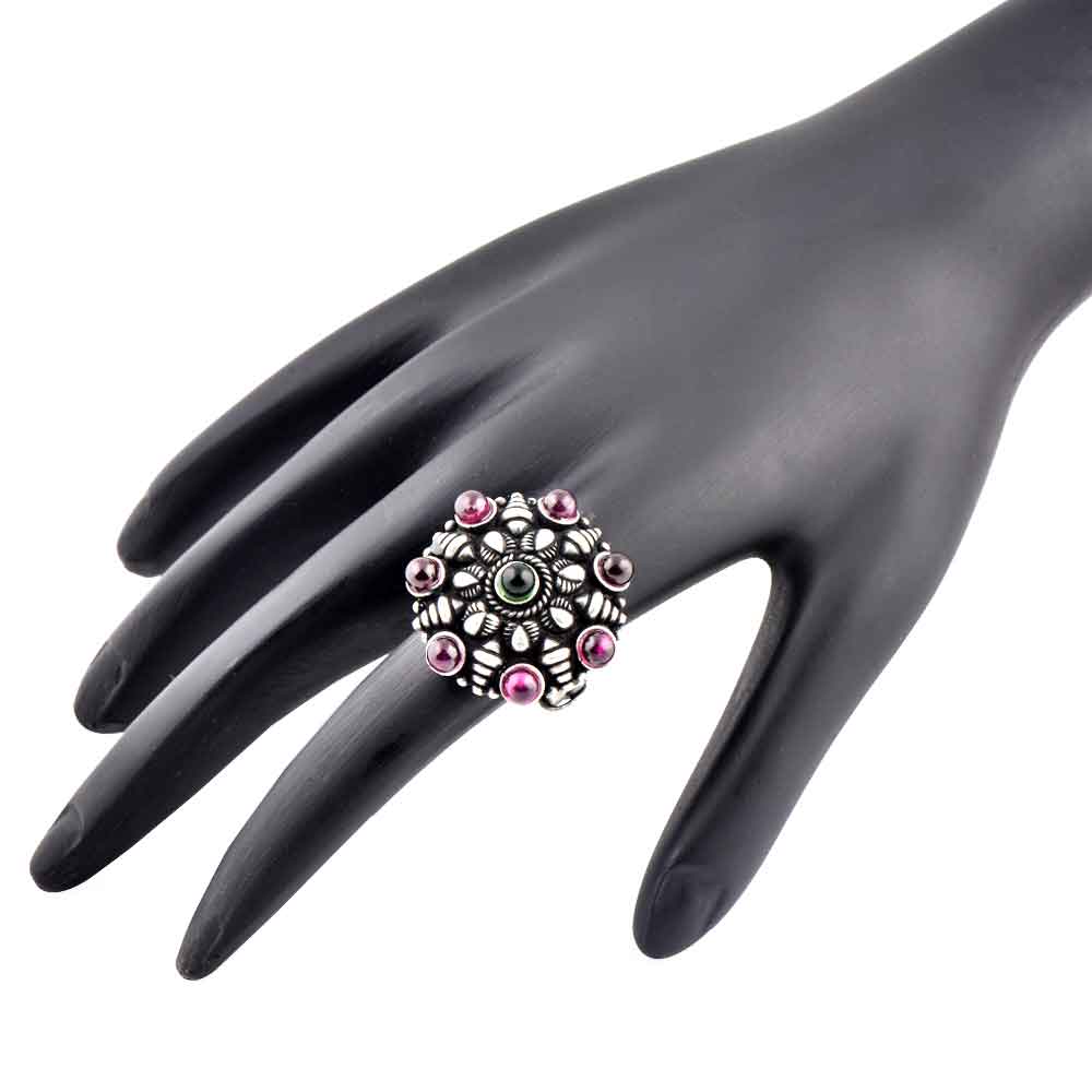 Several Amethyst Studded 92.5 Sterling silver ring is embellished with embossed motifs to create a new and unique design. This ring is very popular with girls and women and is usually worn on a get together party, birthday party ,as a souvenir or as a parting gift.