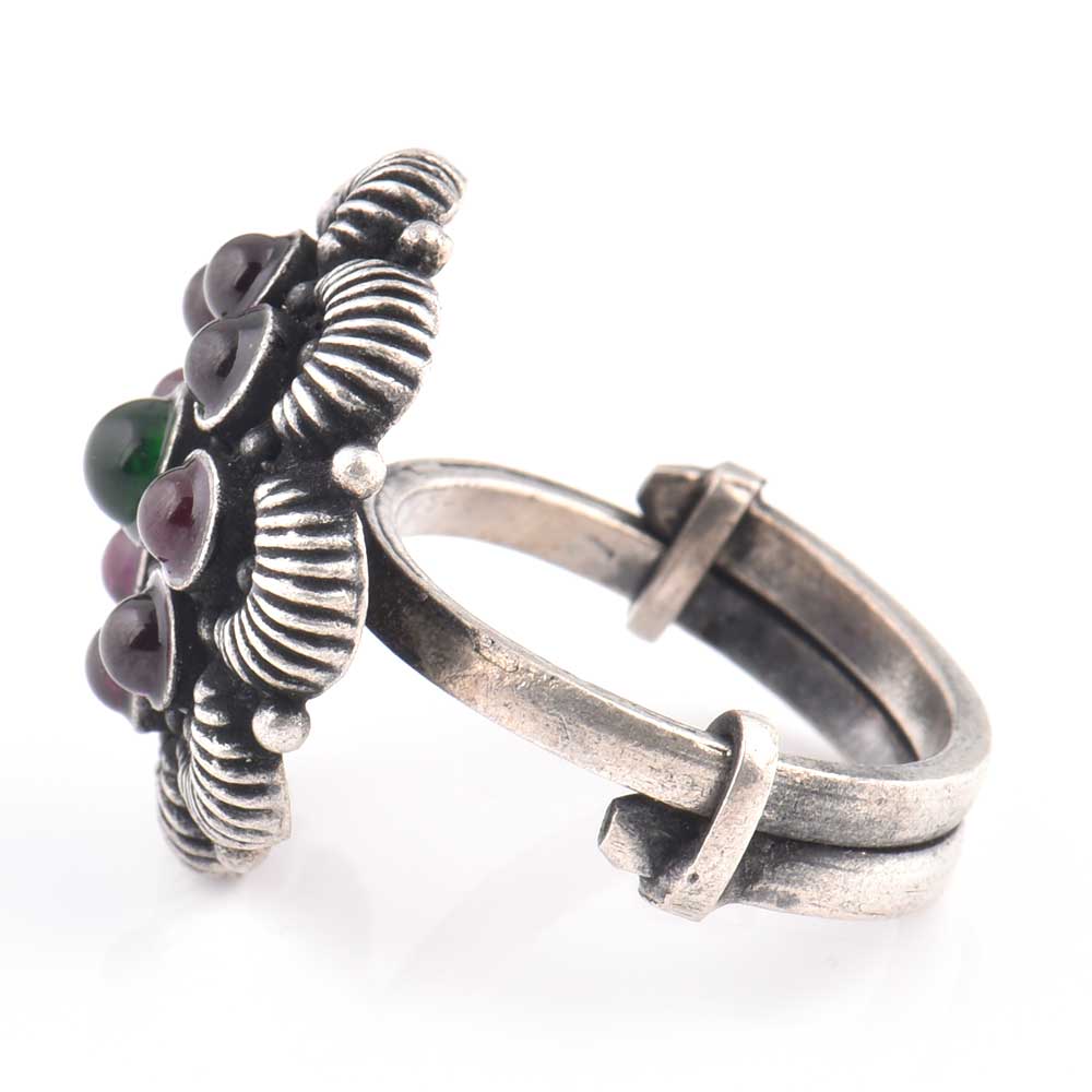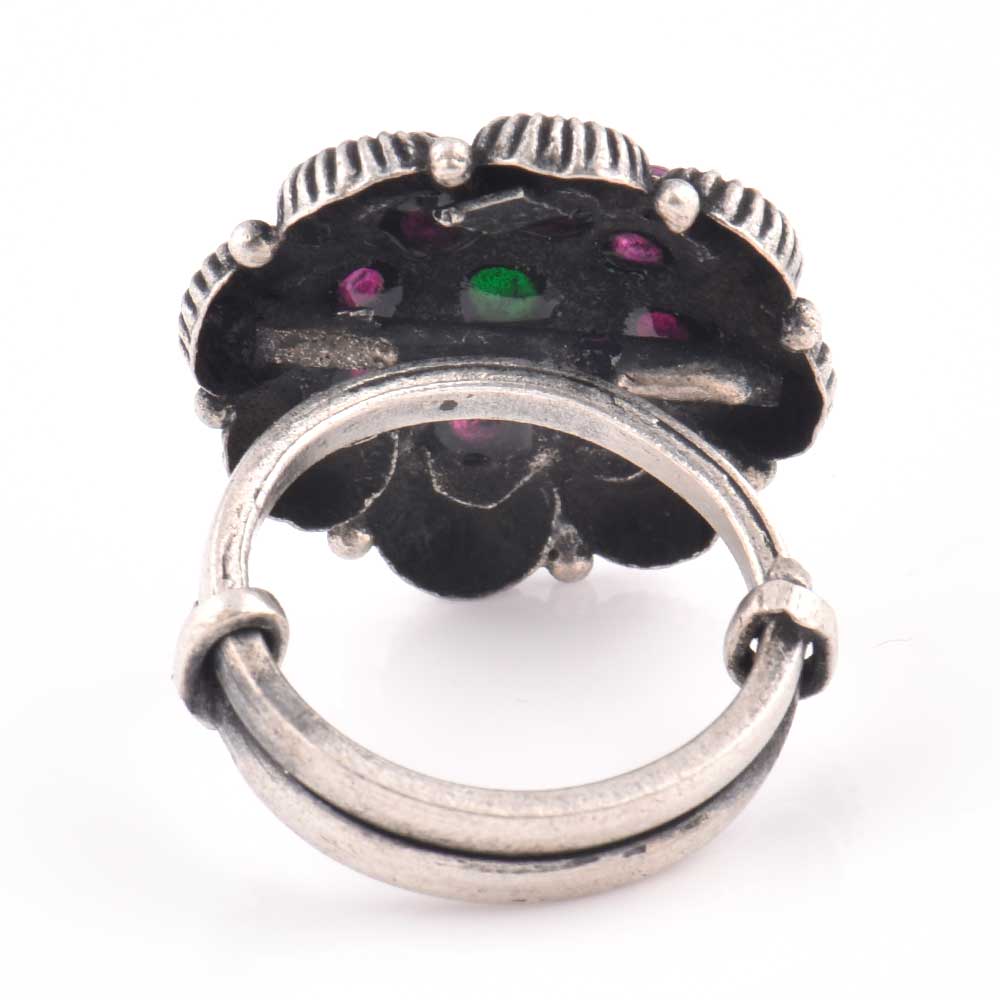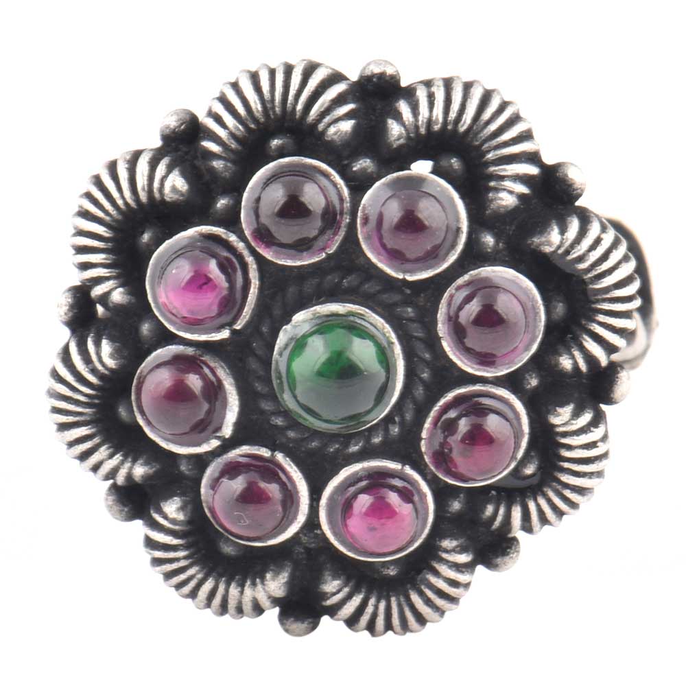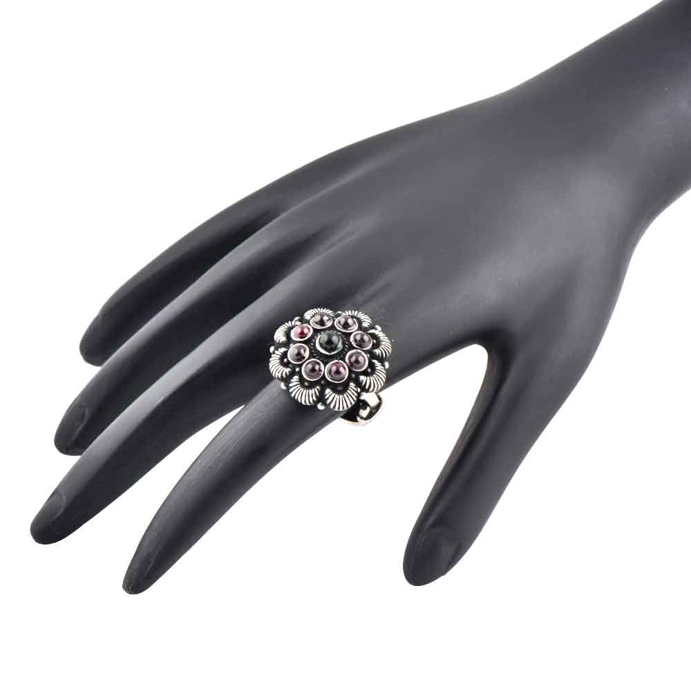 Handmade 92.5 Sterling Silver Ring decorated with engraved petals with many small amethyst stone in a ring form with a green onyx stone in the centre of the flower design ring.