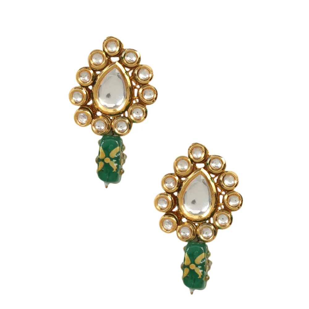 The Emerald Enamel Mirror Drop Earrings with Handcrafted Gold Tone Finish offer a delicate balance of color and shine. Designed in polished golden brass, these earrings feature luminous white mirror stones framed with rich emerald enamel accents. The compact 1.5-inch drop silhouette adds graceful movement without overwhelming the look. Crafted with traditional detailing, this pair brings understated heritage elegance to festive and everyday ethnic styling.