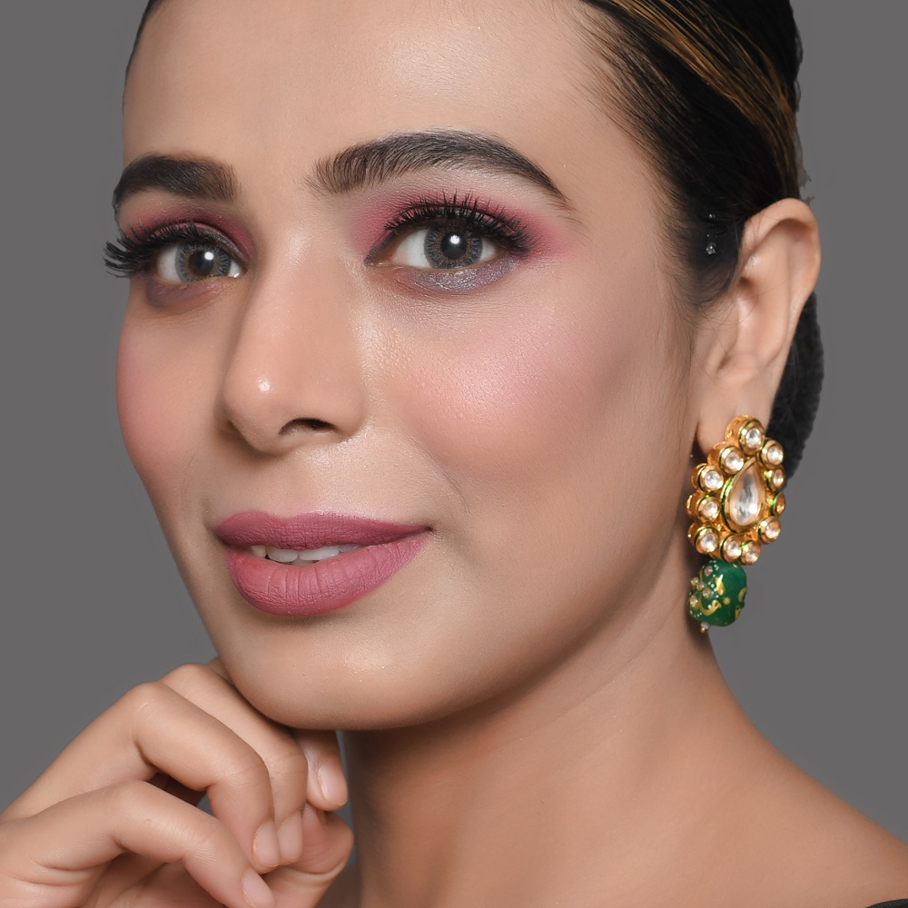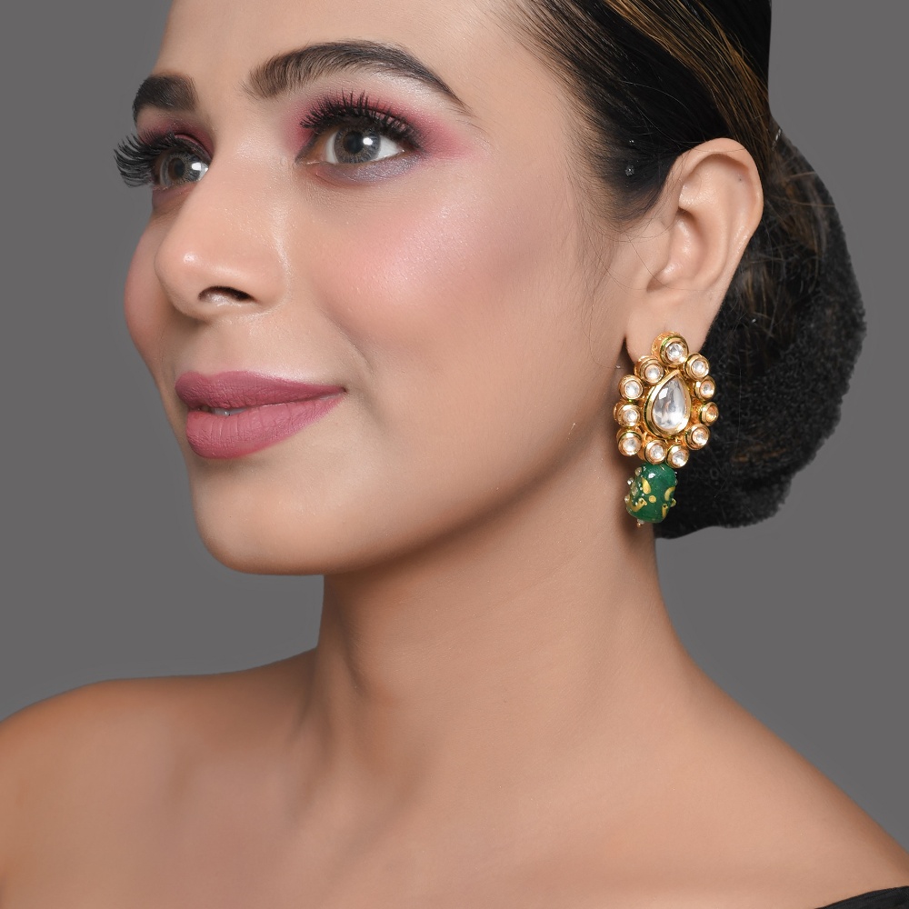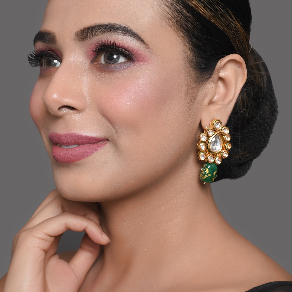 Elegant and richly detailed, these mirror drop earrings feature a classic teardrop silhouette framed with reflective mirror-style stones and finished with a deep green enamel bead accent. Designed to add refined charm, this handcrafted pair blends traditional artistry with timeless appeal. Earring Highlights Individually handcrafted, these earrings showcase intricate detailing and balanced proportions inspired by heritage jewellery techniques. Teardrop mirror stone centre with halo-style setting Deep green enamel bead accent for contrast and depth Handcrafted gold-tone metal framework Lightweight drop design for comfortable wear Artisan-made with attention to symmetry and finish Specs & Materials Material: Metal alloy with mirror-style stones and enamel detailing Colour: Warm gold tone with clear mirror stones and green accent Design: Drop earrings with classic ethnic styling Origin: Handmade in India and individually quality-checked Natural variations may occur due to handcrafted workmanship Styling & Gifting Ideal for festive wear, weddings, and traditional occasions Pairs beautifully with sarees, lehengas, and ethnic outfits A thoughtful gift choice for celebrations and special moments Adds elegance without overpowering the look Care Instructions Store in a dry pouch away from moisture and perfumes. Gently wipe with a soft cloth after use to maintain shine and detailing. Artisan Craftsmanship This jewellery piece is entirely handmade using traditional methods. No machines are used in the crafting process, ensuring each pair carries a unique artisanal character.