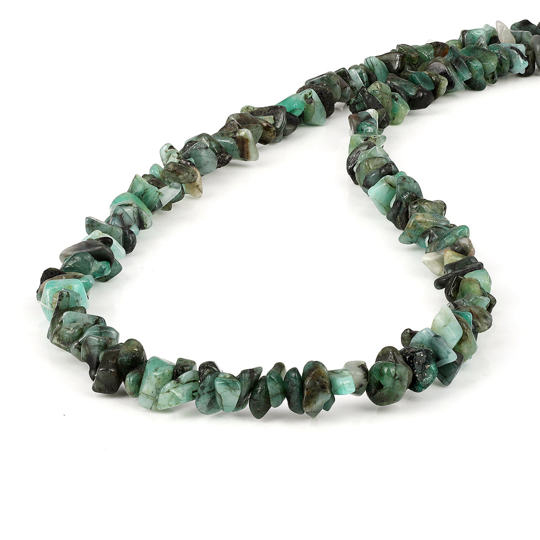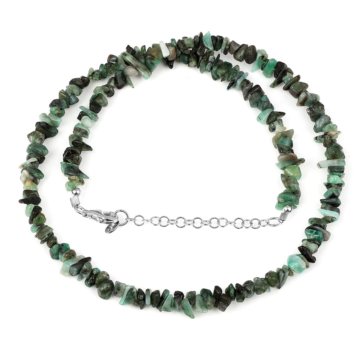 Wipe stones gently with a soft cloth and store the necklace in a dry pouch to protect both the emerald texture and the silver-look shine.