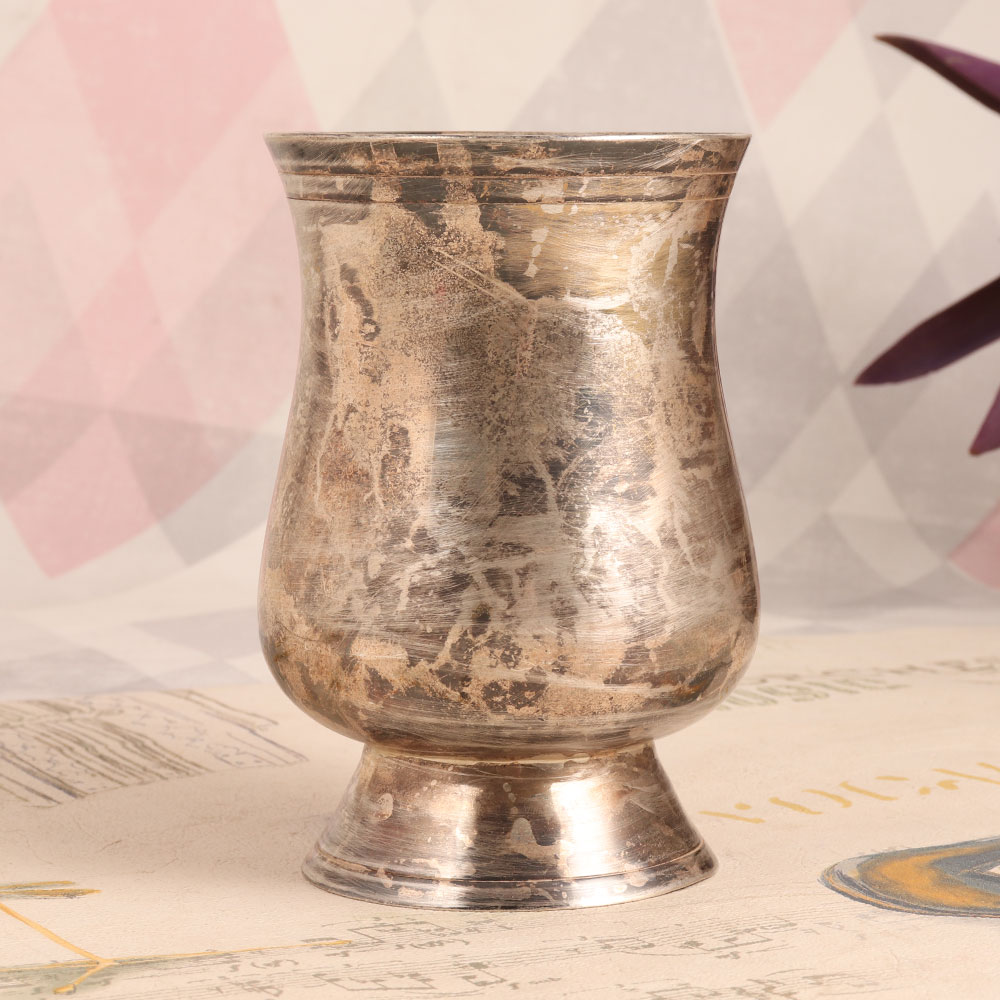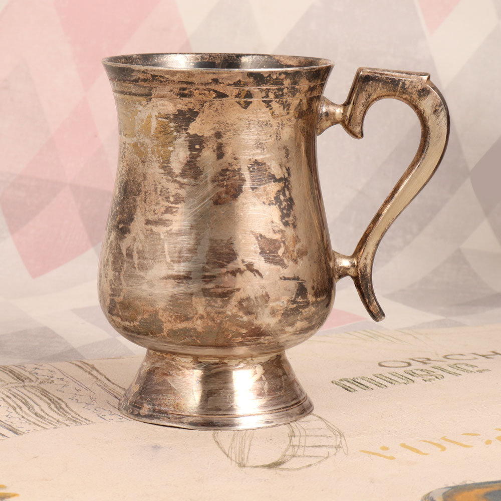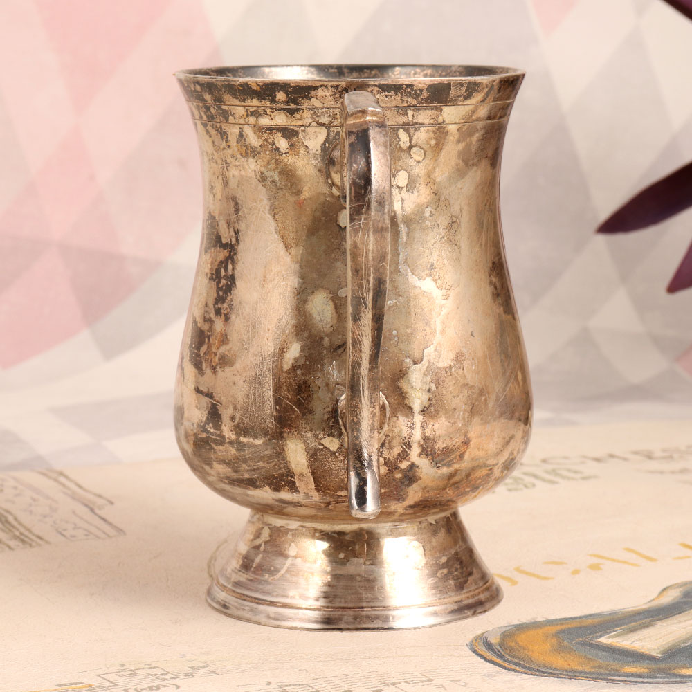 Enhance your decor with a touch of classic elegance by adding this exquisite vintage white metal mug to your collection. Crafted in the timeless English Art style, this mug exudes a sense of timeless charm. Made from high-quality white metal with a lustrous silver plating, it boasts a delicate sheen that catches the light, creating an aura of sophistication. The white metal mug is adorned with a meticulously designed handle and finished in an antique brown tone, highlighting the intricate craftsmanship of skilled artisans. Its unique aesthetic blends seamlessly with a variety of interior themes and styles, making it a versatile addition to your home, office, restaurant, hotel, cafe, or shop. However, please note that due to its vintage nature, we recommend using it primarily for decorative purposes. This mug is a remarkable addition to any vintage collection and serves as a thoughtful gift for your family, friends or relatives on special, festive, or auspicious occasions.