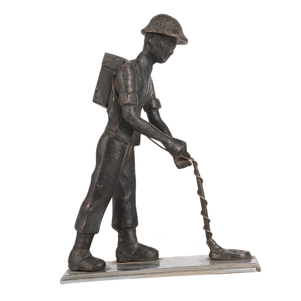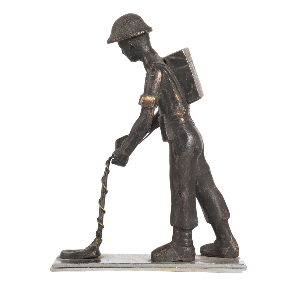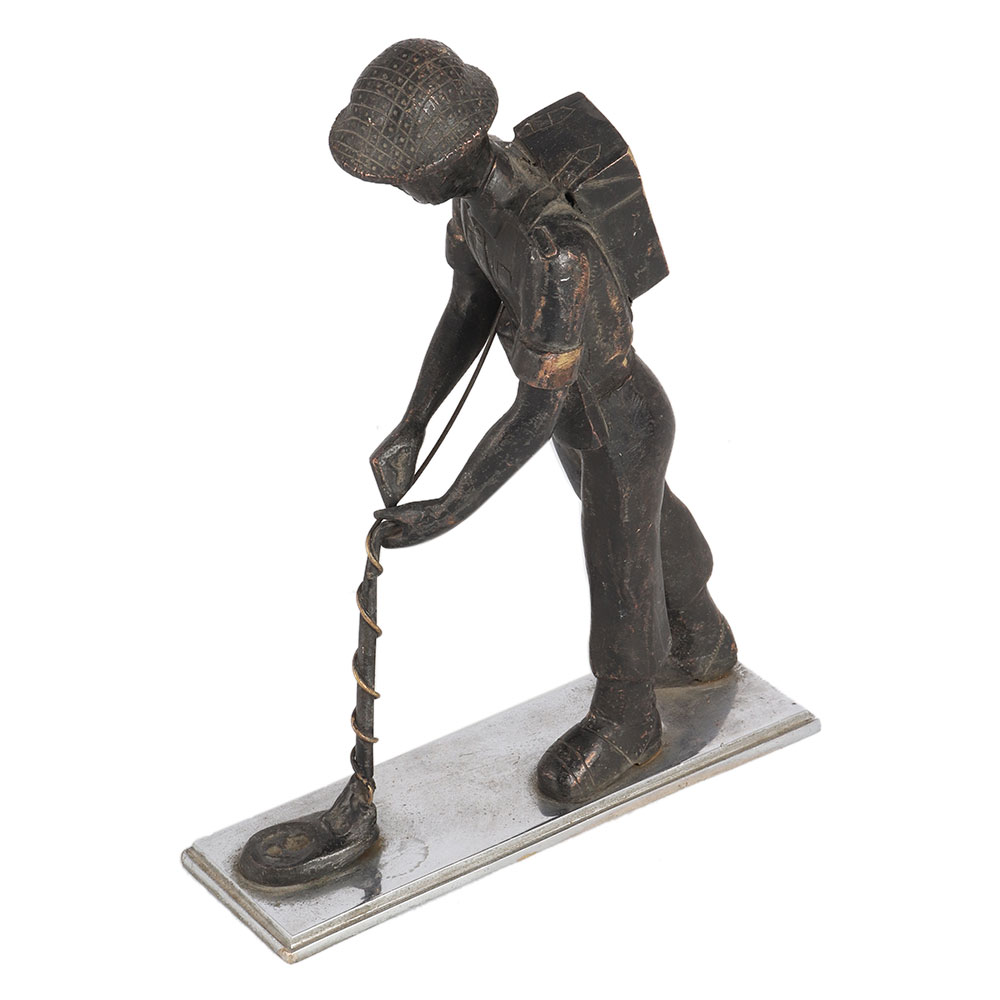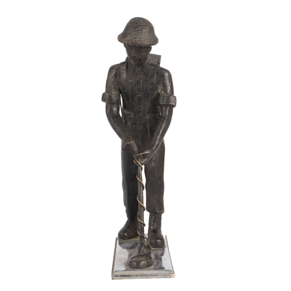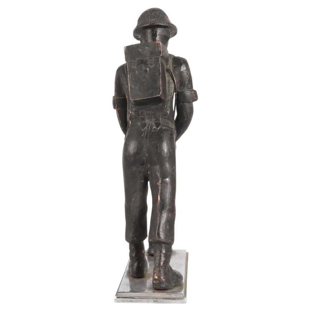 A vintage brass soldier at work in the field, an example of English art. It was carved from brass metal alloy. It has a black colour with antique finish. It was handcrafted by skilled workers from India. A soldier can be seen in this statue wearing a proper uniform and cap. There is a pouch attached to the front of his belt. He uses a machine attached to his bag, which he carries on his shoulders. Put it on your table or shelf to enhance the interior design of your home.