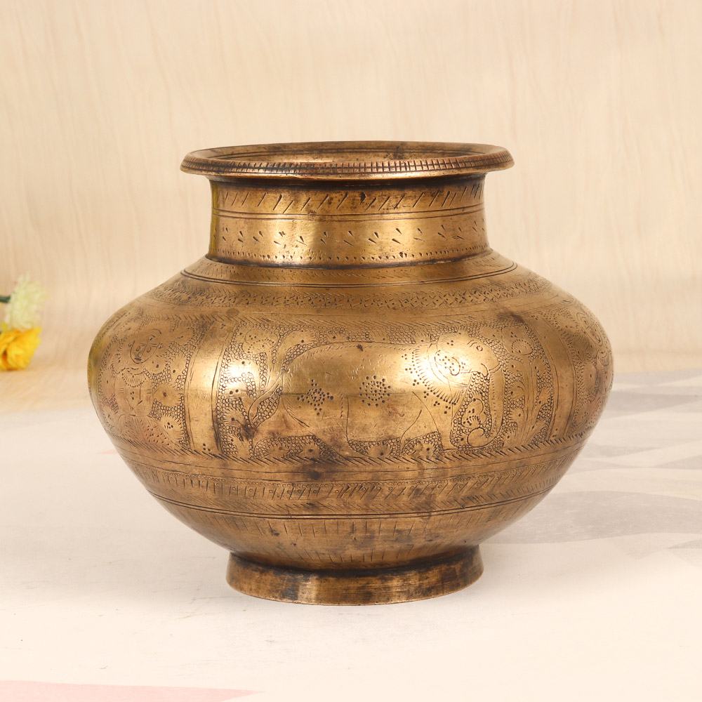 - Handcrafted brass pot with intricate South Indian art engraving