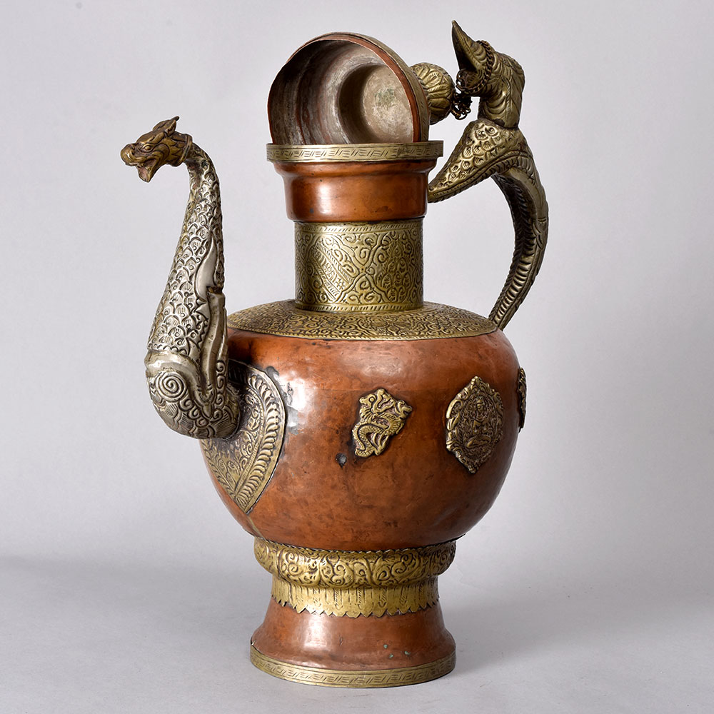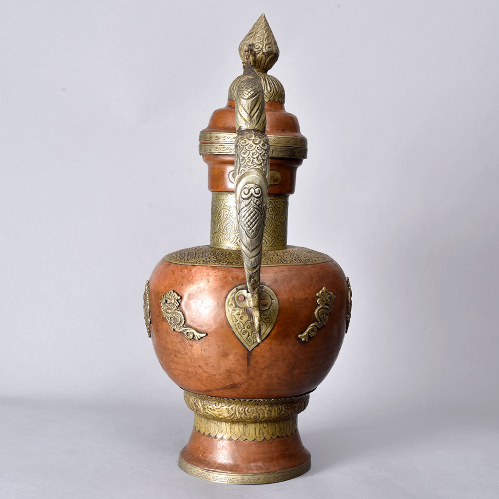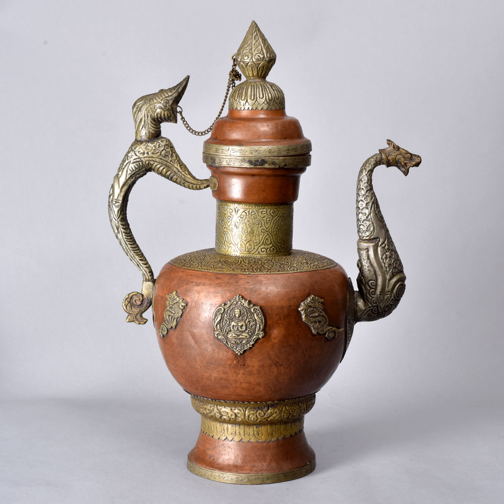 Elevate your tea time with this stunning vintage-inspired copper and white metal kettle. Adorned with captivating Tibetan art engraving, this kettle will transport you to the mystical Himalayas with every pour. Bring the allure of ancient Tibetan craftsmanship into your home with this exquisite kettle. The mesmerizing engraved design elevates the classic silhouette, making this piece a true work of art. Whether brewing a soothing cup of tea or adding a touch of elegance to your tablescape, this kettle will captivate onlookers and infuse your space with a sense of wonder. Designed for the tea connoisseur and decor enthusiast alike, this kettle is a must-have for those who appreciate the beauty of functional art. Imagine the joy of watching the warm glow of the copper body as you heat water for your favorite blend, or the delight of guests as they admire the intricate Tibetan motifs. This kettle is not just a utilitarian kitchen essential - it's a stunning conversation piece that will elevate your daily rituals.