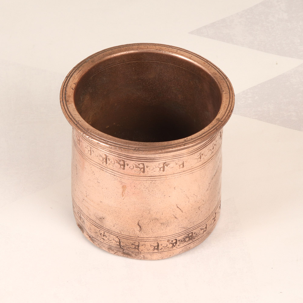Discover the captivating allure of the Vintage copper Panchpatra Pot, a masterpiece of South Indian art that will transform your rituals into moments of pure enchantment. Crafted with meticulous attention to detail, this exquisite vessel embodies the rich cultural heritage of the region, infusing your sacred practices with a timeless essence. Elevate your spiritual journey with the Vintage copper Panchpatra Pot. Its captivating presence will create a serene and sacred atmosphere, allowing you to connect with the divine on a deeper level. Whether you're a seasoned practitioner or new to the world of ritual, this Panchpatra pot will become a cherished companion, enriching your life with the power of tradition and the beauty of South Indian art. Infuse your sacred space with the timeless elegance of the Vintage copper Panchpatra Pot. Its plain brown finish exudes a sense of understated sophistication, while the intricate craftsmanship and symbolic Panchpatra design transport you to the heart of South Indian culture. Bring home this exquisite piece and let it become the centerpiece of your rituals, where the past and present converge in a harmonious celebration of the divine.