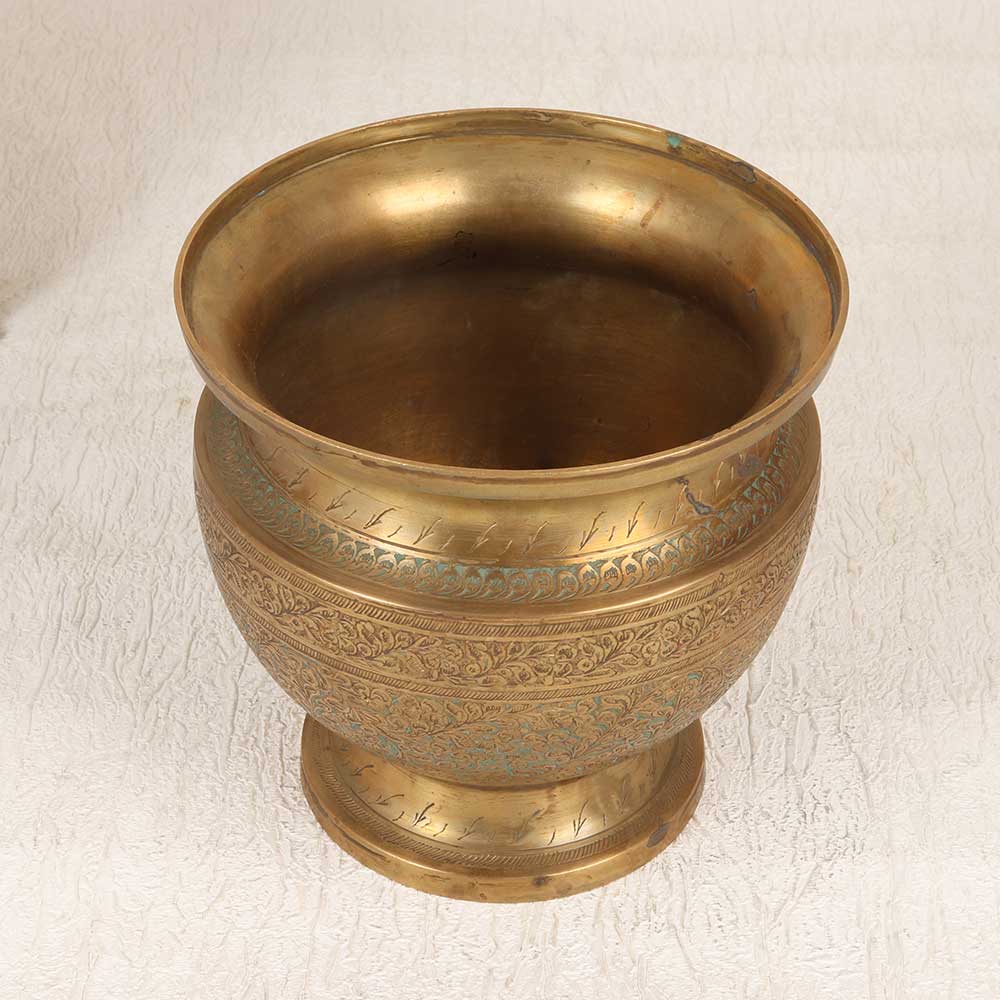 Make a bold statement with this antique-style engraved brass planter featuring the vibrant artistic motifs of Rajasthan. Handcrafted by skilled artisans in India using traditional techniques, each piece bears intricate patterns and designs unique to the maker. This exotic planter brings a touch of bohemian flair to any space with its ornate hand-engraved detailing. The golden patina seems to glow, highlighting the depth and dimension of the artful patterns. Place it in an entryway or living room to mesmerize guests with its exotic beauty and expert craftsmanship. For urban gardeners and design aficionados, this brass planter gives your indoor plants a stylish, handcrafted home. The engraved motifs add visual interest while the brass material provides durability to last for years. Whether standalone or grouped with other accents, this planter infuses your decor with faraway intrigue and artistic heritage. Let your inner bohemian shine!