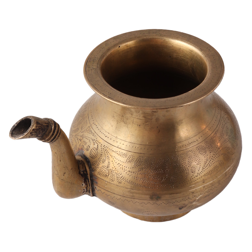 This old ceremonial holy water pot was once used for ablution by Hindus. This Beautiful floral-engraved water pot is made in the Islamic style by skilled Indian artisans. This exquisite hand-engraved pot features an exclusive floral design that covers the entire surface and is ready to become a part of your royal collection. This brass pot with a spout is frequently used as a showpiece, hotel decoration, home decoration, shop decoration, stage decoration, and in wedding rituals in addition to being used to store holy water. The pot has a spout that is attached to one side of the pot; it has a bottom rim for support and a big belly to hold water. It is perfect for gifting.