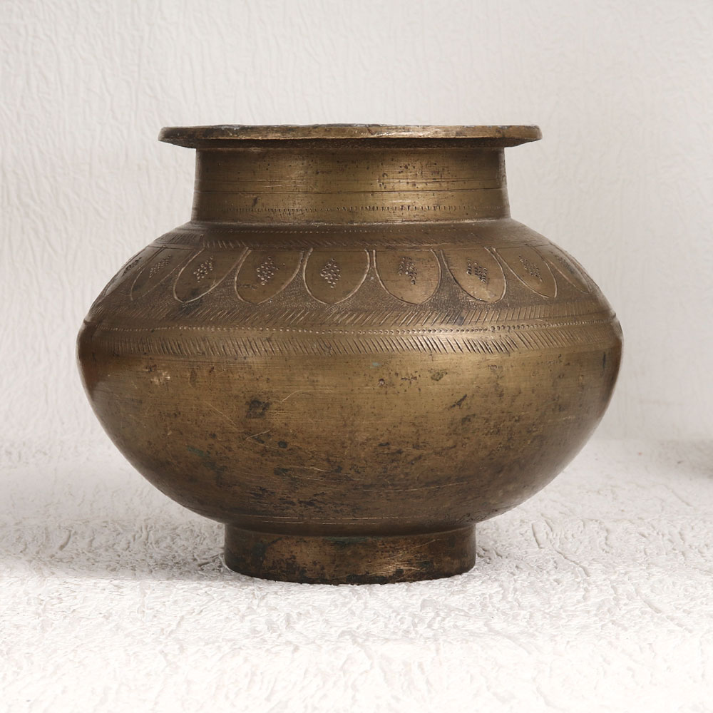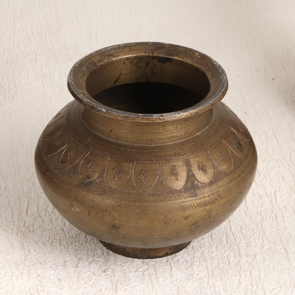 Adorn your space with the charm of our Vintage Brass Holy Water Pot. Handmade by highly talented Indian artisans in the timeless tradition of South Indian Art, this piece showcases the rich heritage of craftsmanship and spirituality. The pot boasts a stunning antique brown finish that accentuates its intricate engravings, making it a true work of art. Crafted from high-quality brass, it exudes durability and a touch of vintage elegance. Versatile in its use, this holy water pot can grace your home, office, restaurant, hotel, cafe, or shop as a tasteful decorative piece. It's not just for aesthetics, it serves a sacred purpose during havan and worship ceremonies, securely holding holy water for blessings. Temples will find this pot fitting for their prayer rituals, adding a touch of authenticity and reverence. For collectors, it's a valuable addition to your vintage treasures, perfect for exhibitions. This exquisite piece makes for a thoughtful gift on special, festive, or auspicious occasions, embodying tradition, spirituality, and artistic excellence.