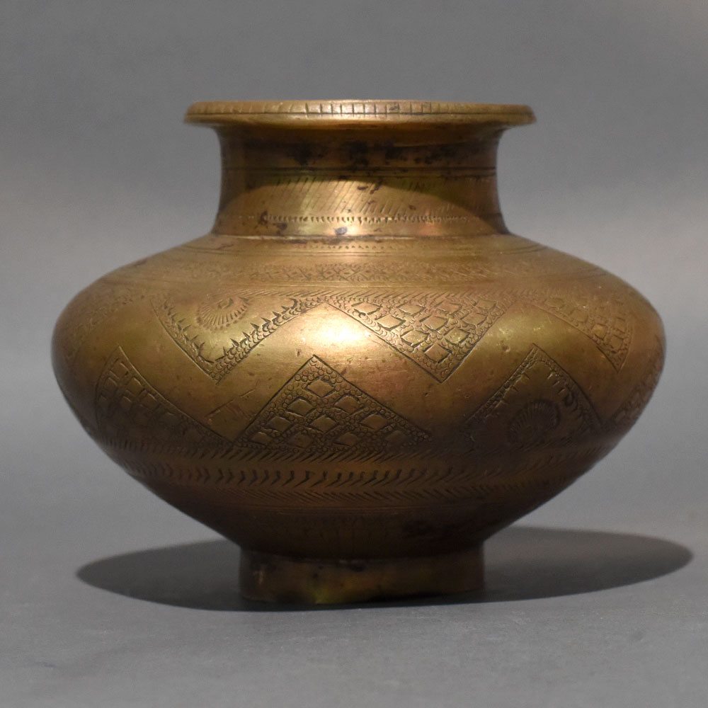 This engraved brass kalash decorative ritual vessel features a broad rounded body adorned with detailed hand-etched geometric and floral motifs. The defined neck bands and gently flared rim reflect traditional Indian metal craftsmanship rooted in ceremonial design. Its balanced form rests on a sturdy circular base, making it ideal for altar placement and ritual use. The surface showcases intricate diamond panel engravings and fine border detailing that encircle the body. These patterns create visual rhythm and highlight skilled metal etching techniques. The aged brass finish displays natural patina and tonal variations, enhancing its antique appeal and authentic character. Over time, the brass develops a deeper warmth, further enriching its heritage presence. Traditionally used as a kalash in Hindu rituals, this vessel symbolizes prosperity, purity, and auspicious beginnings. It can be filled with sacred water and decorated with mango leaves and a coconut during griha pravesh, weddings, Navratri, and festive ceremonies. The wide mouth allows easy filling and ceremonial pouring, while the rounded form ensures comfortable handling. Crafted from solid brass using traditional shaping and engraving methods, this vessel is durable and designed for long-term devotional use. Each piece carries slight variations in engraving depth and surface tone, reflecting genuine handcrafted workmanship.