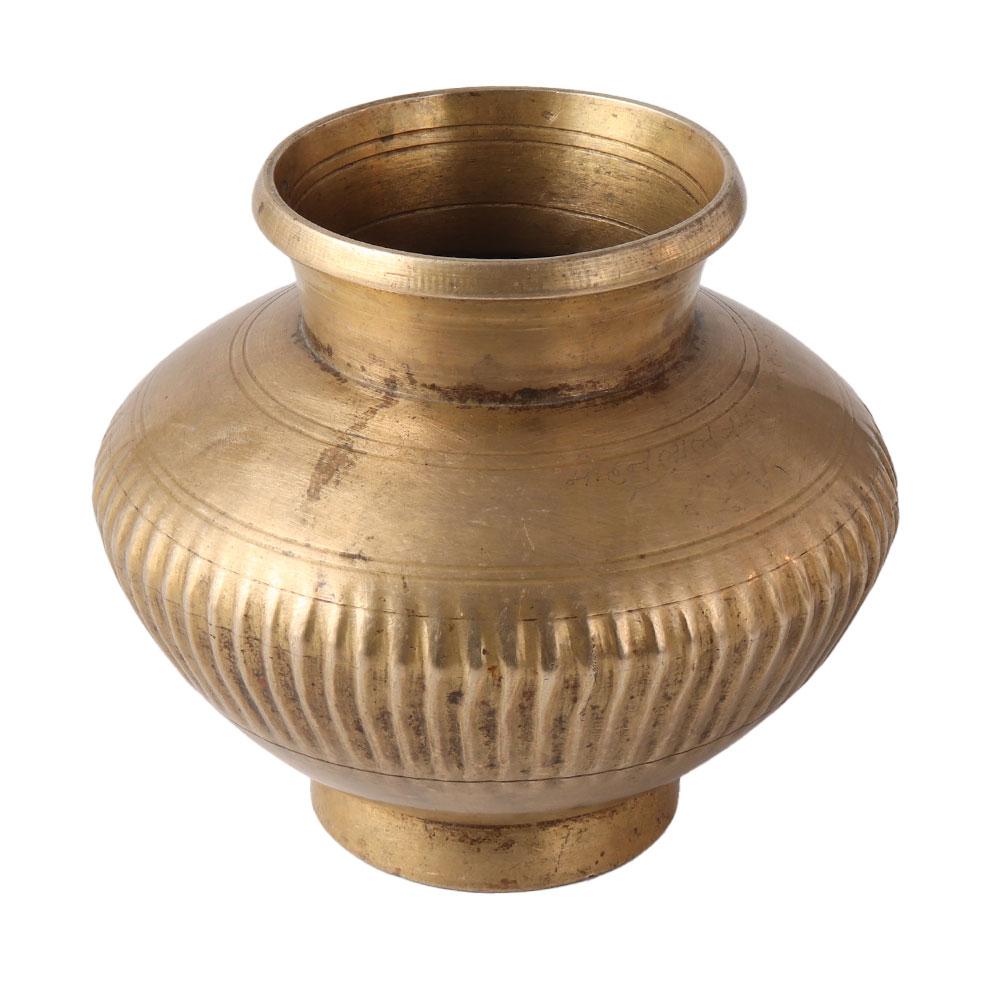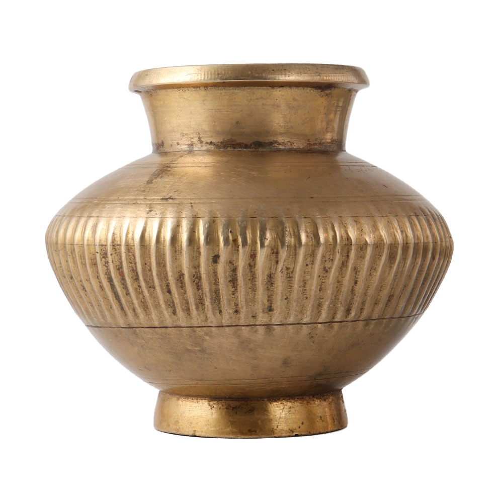 This stunning pure brass Lota or vessel is created by craftsmen from South India and features a gorgeous, artistic form with a rib motif across the vessel. In India, brass Lotas were used to store and serve water. Water was poured from the vessel's mouth , as well as over the hands and feet to cleanse them. The vessel is currently utilised by city dwellers as part of their home design collection or as a vase filled with fresh flowers and displayed prominently in the home.