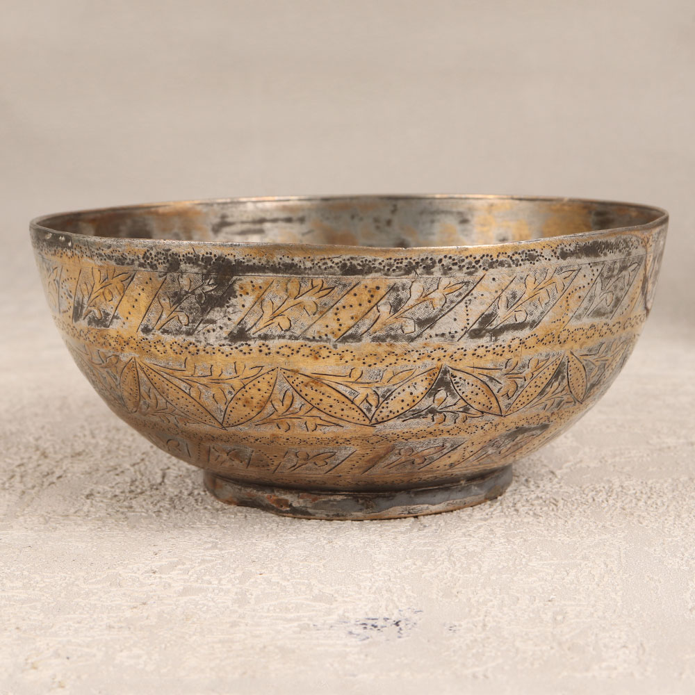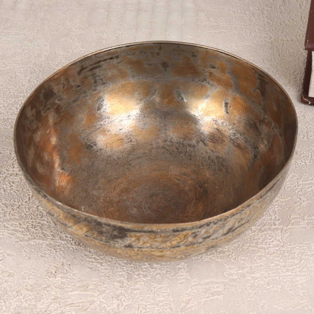 A Brass Engraved Bowl that is a testament to the timeless artistry of Islamic craftsmanship. Handcrafted by skilled artisans, this captivating piece seamlessly blends tradition with sophistication. Crafted from high-quality brass, the bowl features an antique brown finish that accentuates its intricate designs, showcasing the rich heritage of Islamic art. The bowl's surface is adorned with meticulous engravings, each telling a story of cultural significance and unparalleled skill. Its vintage allure makes it a perfect decorative accent for various settings, including homes, offices, restaurants, hotels, or cafes. However, due to its antique nature, we recommend using it primarily for decorative purposes, adding a touch of historical charm to any space. This brass bowl is not just an ornament, it's an invitation to create a curated vintage collection. Its uniqueness makes it an ideal gift for your family, friends or relatives on special, festive, or auspicious occasions. Whether you're seeking to enhance your interior decor or looking for a distinctive present, this Brass Engraved Bowl is a timeless masterpiece that transcends time and cultural boundaries.