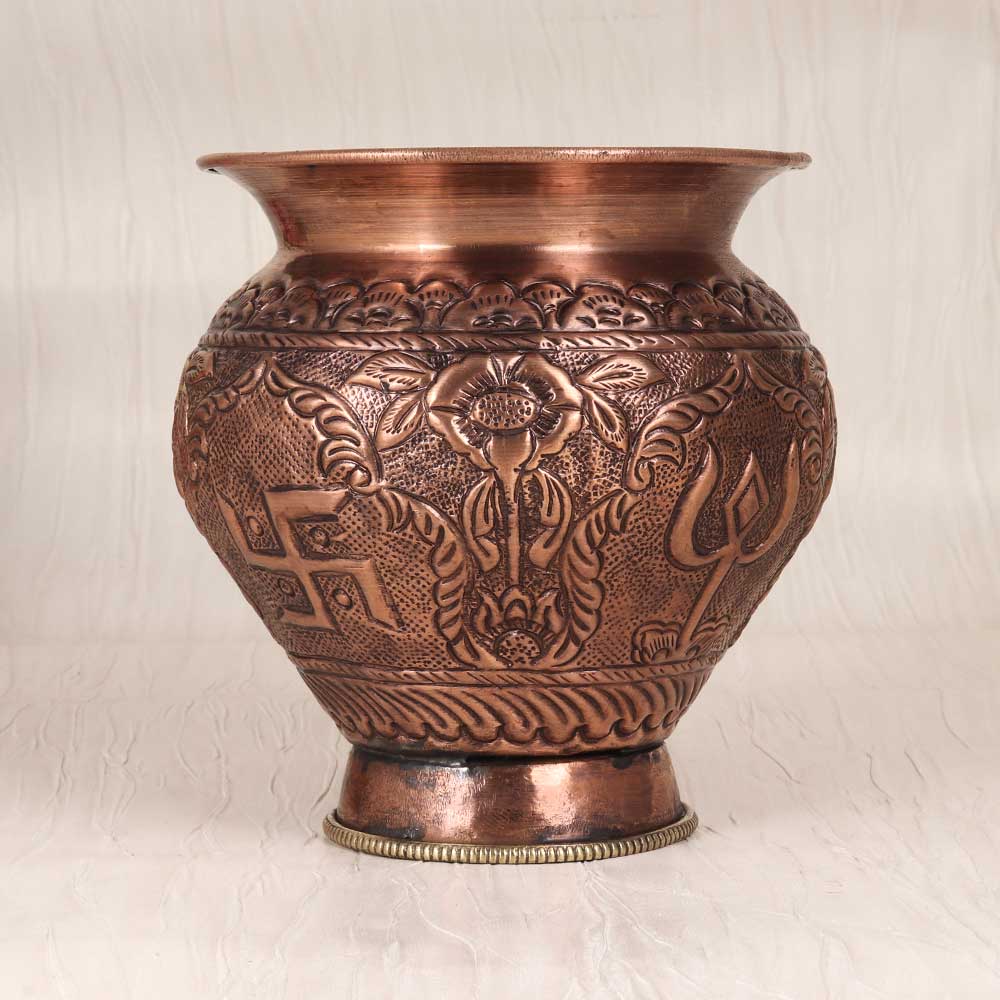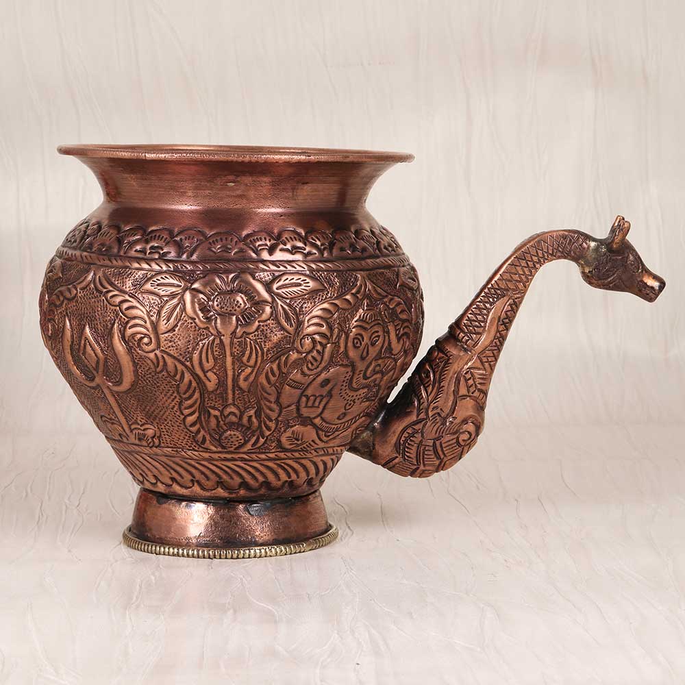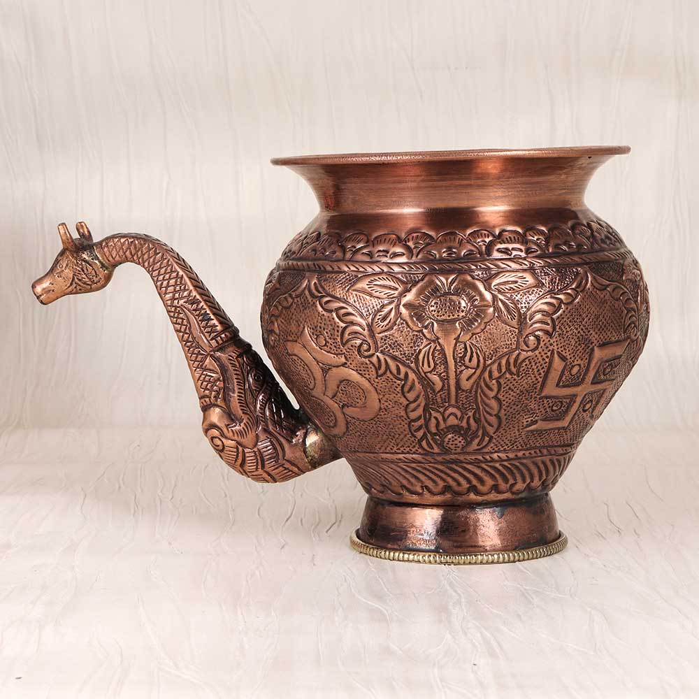 This handcrafted copper water pot merges old-world Ayurvedic design with modern functionality. Featuring a sleek Nandi spout, and engraved floral motifs, it will elevate your drinking experience. Drinking from copper is an ancient Indian ritual. Copper has purification properties - its ions create alkaline water with more bioavailable minerals for improved hydration. Overnight storage allows trace copper to leach into water, making it healthier. This pot's antique Ayurvedic design reminds you to slow down and drink mindfully. Its artisanal craftsmanship and ties to holistic healing make a meaningful gift for yoga enthusiasts. With its stunning copper body and engraved motifs, this pot combines ancient wisdom with modern design. Use it to store and drink purified water, elevating your daily wellness ritual.