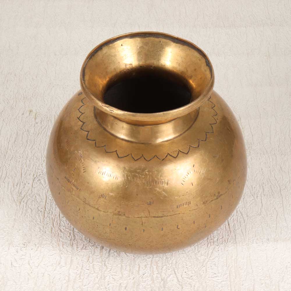 Bring a touch of antiquity and elegance into your home with this beautiful vintage brass pot from South India. This stunning handcrafted pot features intricate floral engravings that add visual interest and reflect the artisanal craftsmanship of its origin. This brass pot makes an ideal planter to showcase your favorite indoor plants and flowers. The metal construction is durable yet lightweight enough for easy moving. Place it on your coffee table, bookshelf, or any flat surface in your home or patio to add a lovely pop of greenery. The vintage styling gives it a timeless, heirloom-quality look that elevates any space. For plant lovers and vintage decor enthusiasts, this engraved brass pot from South India is sure to be a treasured addition to your home. Displaying plants in this ornate vessel will bring the beauty of nature indoors while the handcrafted detailing provides a meaningful touch of history. Give your home a breath of fresh air and old world charm with this lovely accent piece.