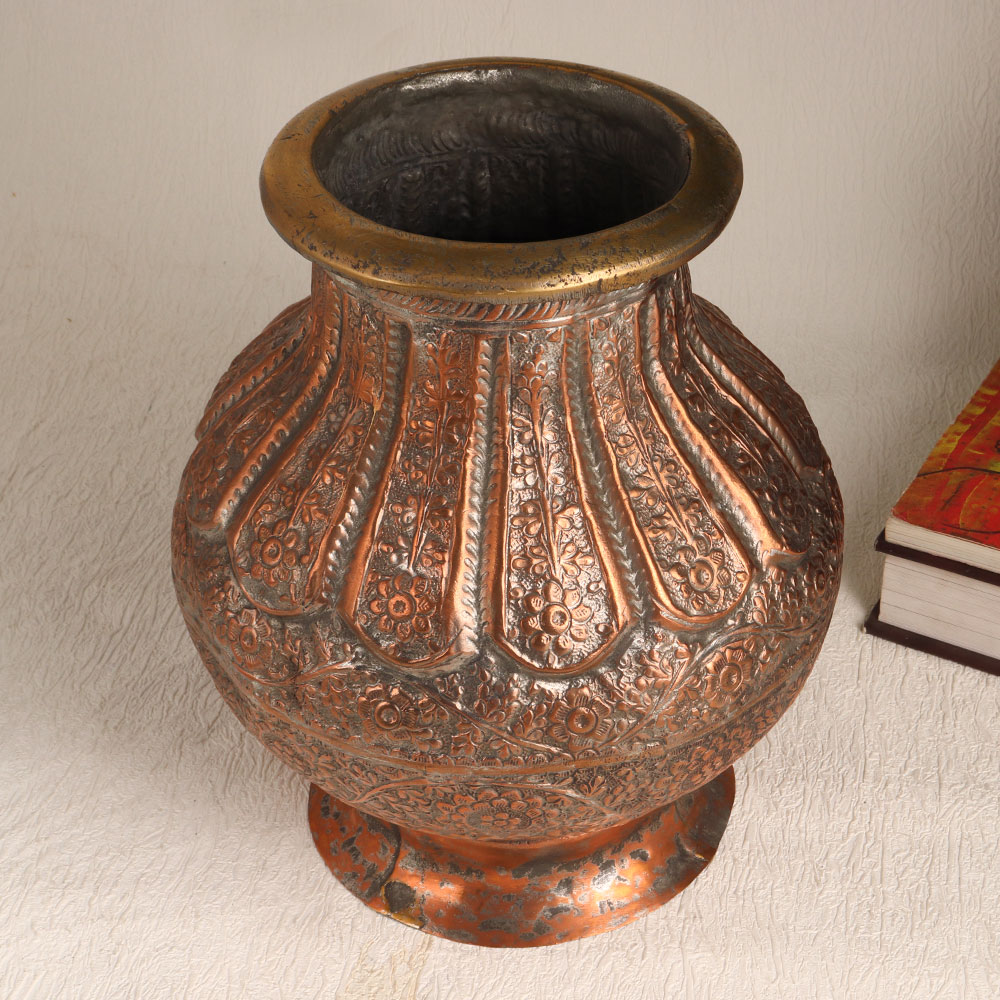 Adorn your interior with the timeless elegance of this exquisite vintage copper pot. Handmade by highly skilled Indian artisans in the iconic Islamic Art style of Hyderabad, this piece showcases exceptional craftsmanship and intricate carving. Its antique brown finish exudes an aura of vintage charm, making it a captivating addition to any space. Crafted from high-quality copper, this pot radiates an enduring luster, and its sturdiness ensures its longevity. Its versatility is unmatched, as it can enhance the ambiance of your home, office, restaurant, hotel, cafe, or shop. Whether it's displayed as a unique flower pot or integrated into a curated vintage collection, this pot adds a touch of grandeur to any setting. This striking piece also makes for a thoughtful gift, perfect for special, festive, or auspicious occasions. Share the beauty of Indian artistry and history with your family, friends or relatives, and let this vintage copper pot become a cherished heirloom in their homes.