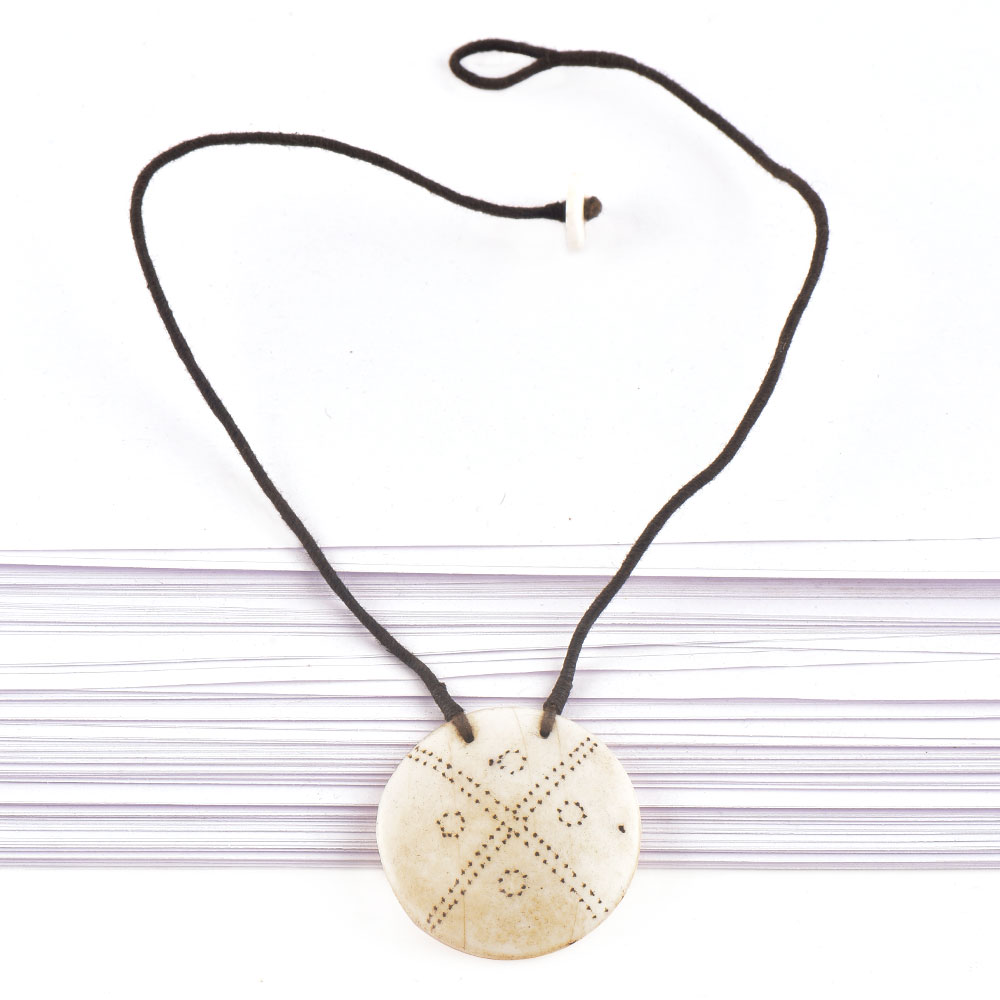 This single engraved geometric design on seashell pendant is made by the local artisans of India .The jewelry is made of a number of shell or two to three whole shells that are drilled with adjustable black thread which makes it easy to wear and fit.