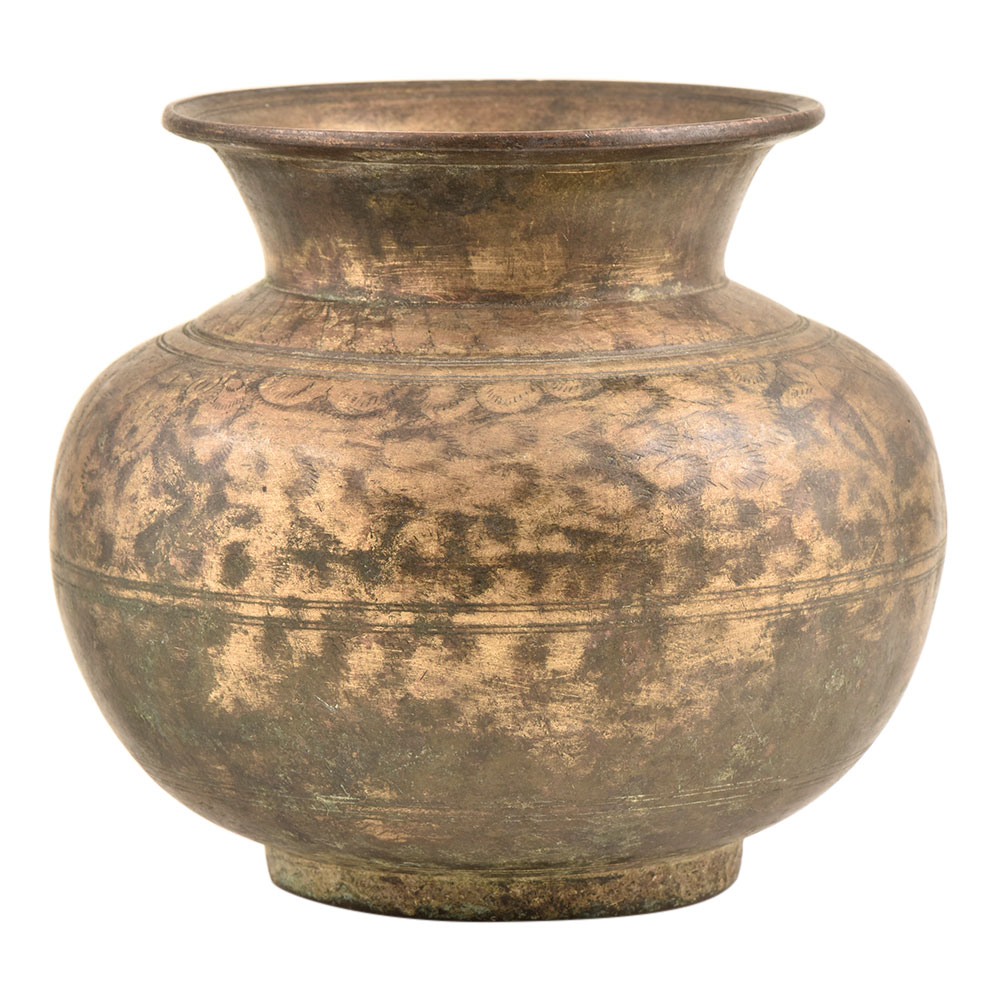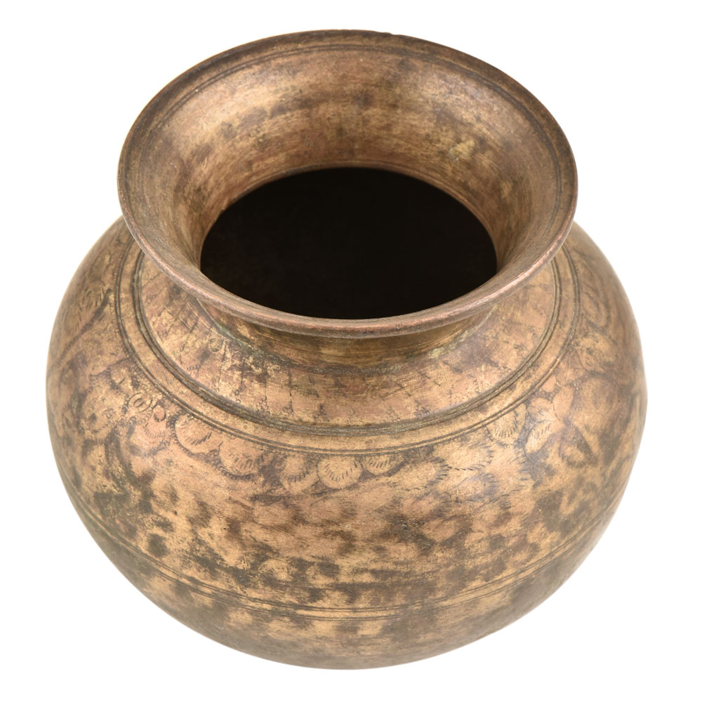 Engraved Brass Water Pot (Lota) From North India is Handmade by the Local Artisans and Each Pot has a Distinct Design No Two Pots are Identical. The Pot Carries the Distinct Design of the Time. This Exquisite Piece is a Treat for Collectors and Makes for a Wonderful Decor Accent.
