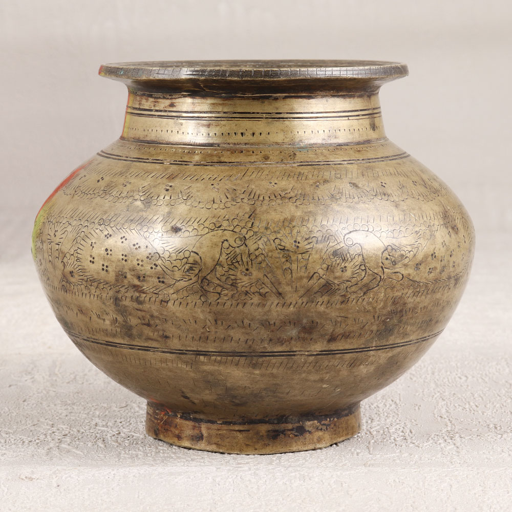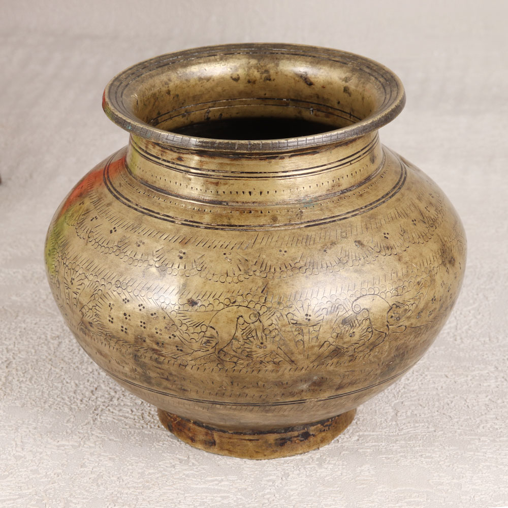 Buy a Vintage Brass Holy Water Pot online which is a timeless masterpiece handcrafted by highly skilled and experienced artisans from Northern India. This exquisite piece, with its intricate carvings and antique brown finish, embodies the rich cultural heritage of the region. Perfect for prayer, havan, and auspicious occasions, this pot serves as a vessel for holding sacred water or adorning with vibrant flowers. Crafted from high-quality Brass, the pot reflects the artisan's dedication to precision and traditional craftsmanship. Its versatile design allows it to enhance the ambiance of homes, offices, restaurants, hotels, or cafes, serving both a functional and decorative purpose. This unique artefact seamlessly blends spirituality with artistry, making it a coveted addition to any vintage collection. Share the divine energy by gifting this holy water pot to your family, friends or relatives on special, festive, or auspicious occasions.