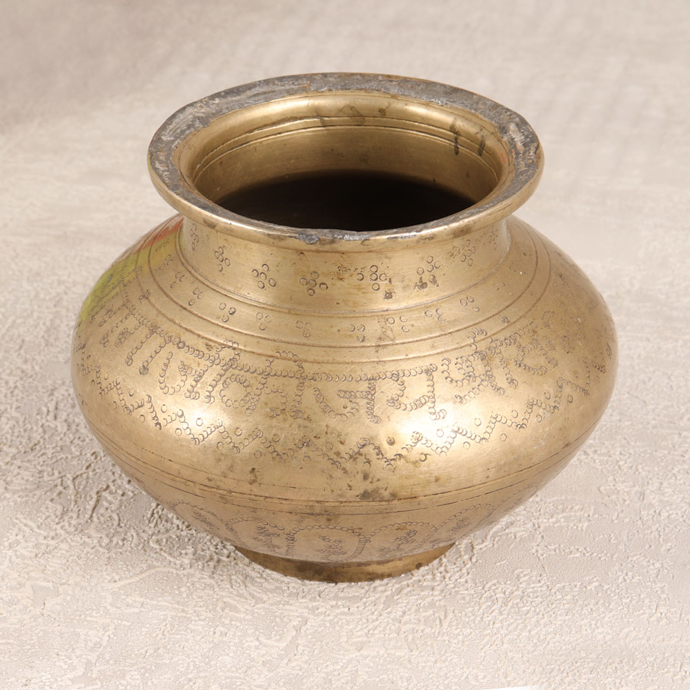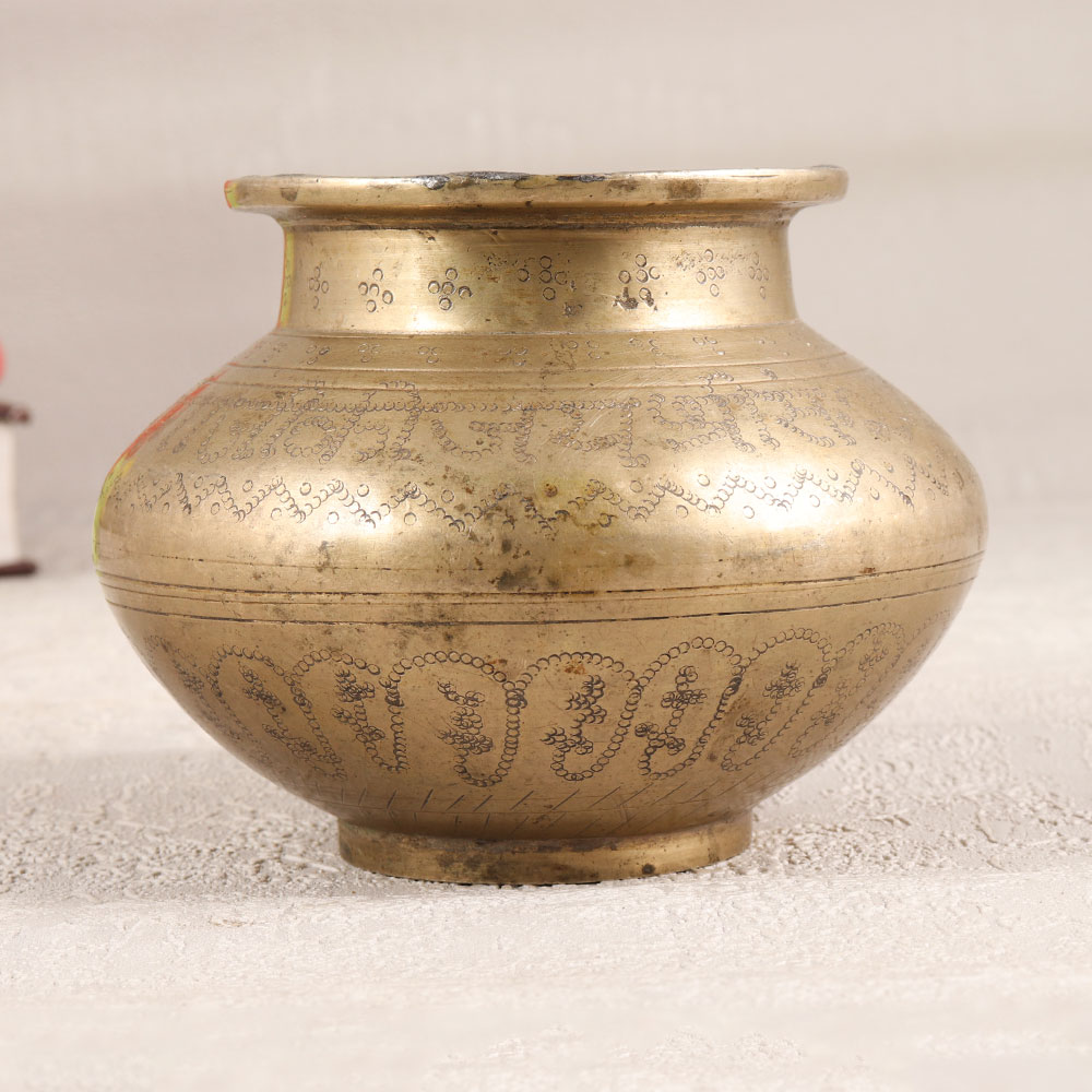 Decorate your home interior with this Vintage Brass Holy Water Pot from the skilled artisans of Gujarat, India. Handcrafted with precision, this lota features intricate carvings that add a touch of timeless elegance to your prayer, havan, or auspicious occasions. The antique brown finish lends a rustic charm, showcasing the artistry of high-quality Brass. Versatile in its use, it gracefully cradles holy water during rituals and serves as a delightful vessel for flower decorations. Embrace the heritage of Indian craftsmanship as you display this piece in your home, office, restaurant, hotel, or cafe, instantly transforming any space into a haven of serenity and cultural richness. This handmade masterpiece is not just a decorative item but a symbol of tradition and reverence. Ideal for collectors of vintage treasures, this holy water pot is a unique addition to your ensemble. Share the blessings by gifting this artisanal marvel to your family, friends or relatives on special, festive, or auspicious occasions.