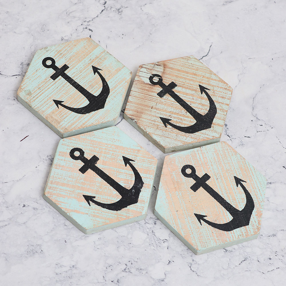 Buy a best wooden coaster set you\'ll ever come across on internet and get a hassle free delivery at your doorstep. Crafted with utmost precision by talented craftsmen, this Pack of 4 coasters is a testament to their impeccable craftsmanship. Each coaster boasts a captivating hexagon shape, carved from high-quality wood and finished with an enchanting combination of antique brown and sky blue, adding a touch of elegance to any setting. Adorning these coasters is a unique black finish anchor engraving, further enhancing their charm and character. Not only are these coasters visually stunning, but they also serve a practical purpose. Use them to safeguard your surfaces from unsightly stains caused by water, tea, juice, or coffee glasses, whether it\'s at home, the office, a restaurant, hotel, or cafe. The antique finish of these coasters transforms them into decorative pieces that effortlessly elevate the ambiance of any space. This exceptional Wooden Tea Coaster Set also makes for a thoughtful gift for your loved fours on special or festive occasions.