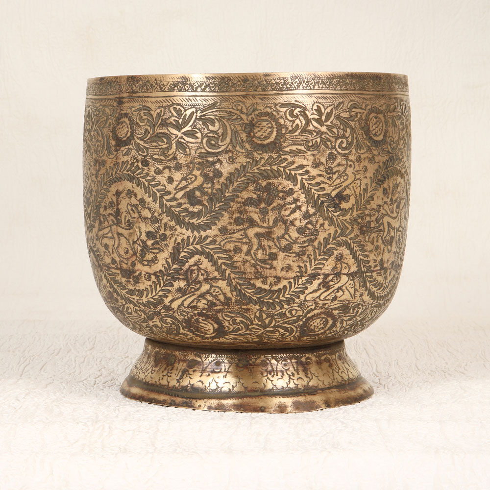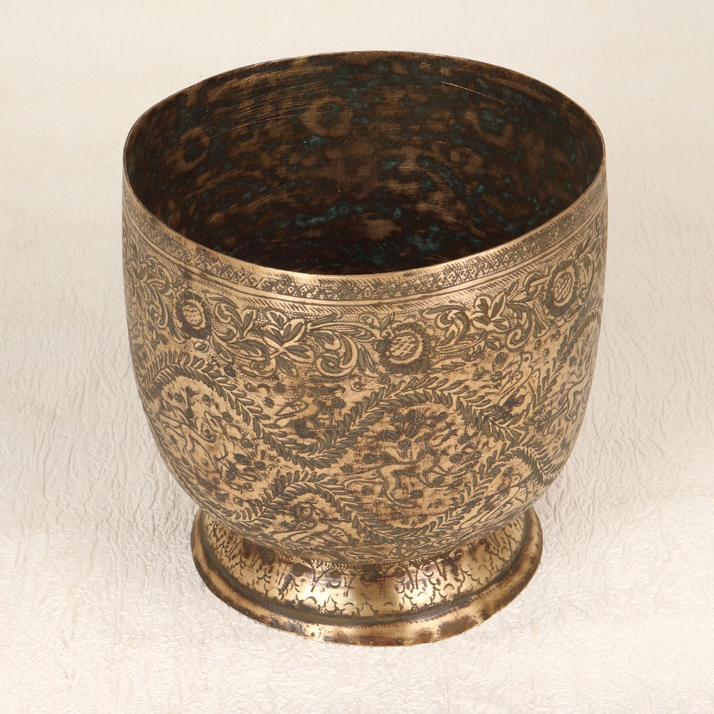 Adorn your living room with the timeless charm of this Vintage Brass Pot that is a masterpiece crafted by highly talented Indian artisans hailing from the culturally rich region of South India. Meticulously handmade from high-quality brass, the pot boasts a stunning antique brown finish that lends an aura of classic elegance to any setting. The pot is adorned with enchanting engravings featuring intricate depictions of birds and animals, showcasing the artisan’s exceptional craftsmanship and attention to detail. This one-of-a-kind piece seamlessly blends traditional aesthetics with modern sensibilities, making it a versatile addition to various environments, including homes, offices, restaurants, hotels, or cafes. Its purpose extends beyond mere decor – doubling as an indoor flower pot, the Vintage Brass Pot breathes life into any space it graces. This piece is not just an item of beauty but a symbol of heritage and artistry, making it an ideal addition to any vintage collection. Furthermore, with its timeless appeal, it serves as a thoughtful and meaningful gift for your family, friends or relatives on special, festive, or auspicious occasions.