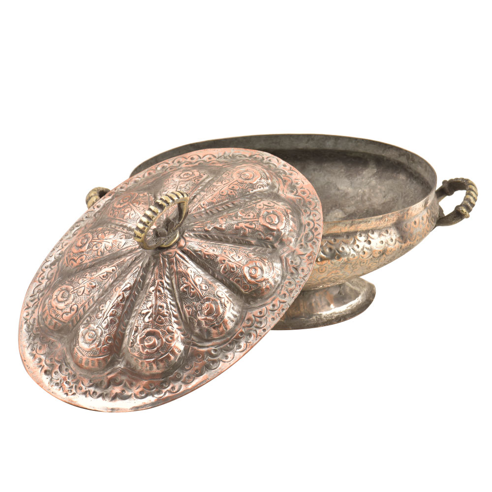 Hand crafted by the expert craftsmen of India in classic chinar vines on the entire lid and bowl. It mounts on a well crafted base with a lid that has a carved finial to give it the classic traditional look. Surprise your elite circle of friends with this classic copper serve ware on the display shelf of your dining room.