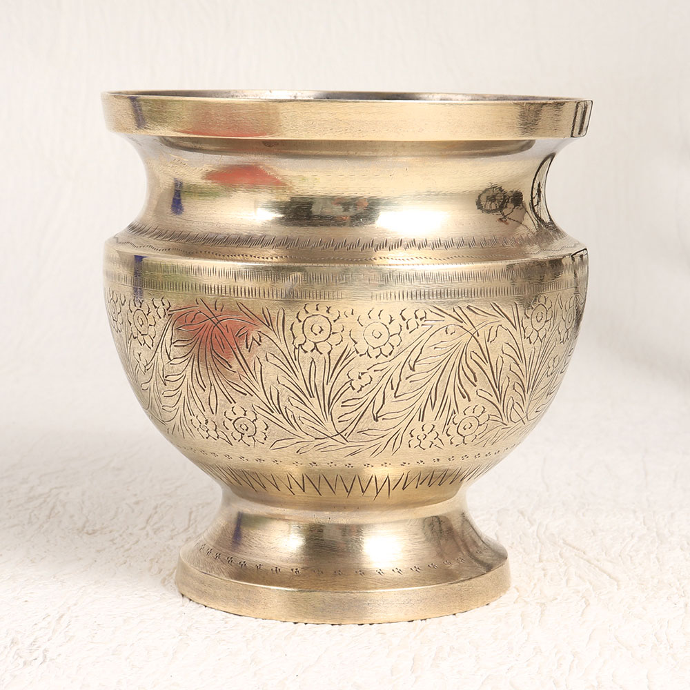 Buy a Vintage Brass Flower Pot online which is a true masterpiece meticulously crafted by highly talented Indian craftsmen hailing from the historic city of Hyderabad. This stunning piece is a testament to the timeless artistry of the subcontinent, combining the rich heritage of brass craftsmanship with intricate designs that are truly captivating. The shiny golden finish adds a touch of opulence to this already remarkable piece, making it a standout decor element for any setting. Crafted from high-quality brass, this flower pot is not only a symbol of elegance but also boasts durability and longevity. It is a versatile addition to your living space, suitable for home, office, restaurant, hotel, cafe, or shop, serving as a sophisticated vase for your favourite blooms or a statement piece in your vintage collection. Whether for personal enjoyment, exhibition, or as a heartfelt gift for your family, friends or relatives during special, festive, or auspicious occasions, this Vintage Brass Flower Pot is sure to leave a lasting impression.