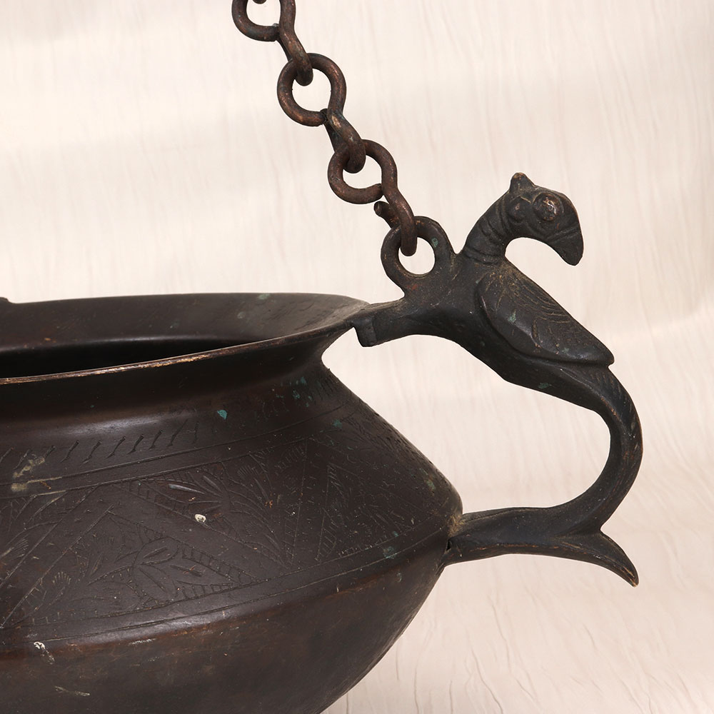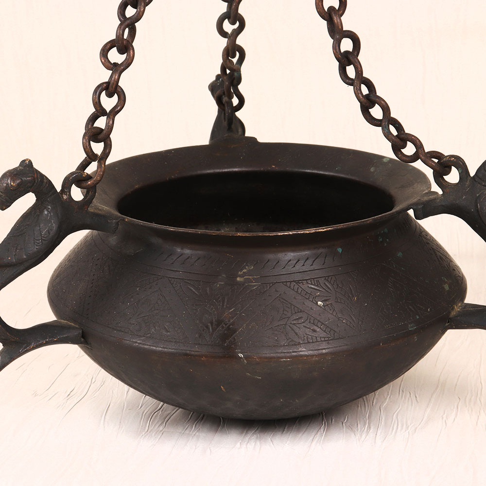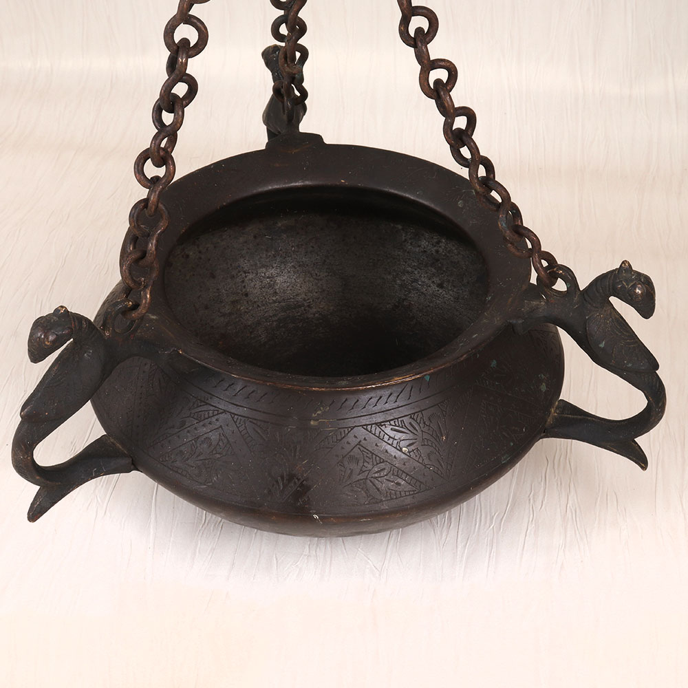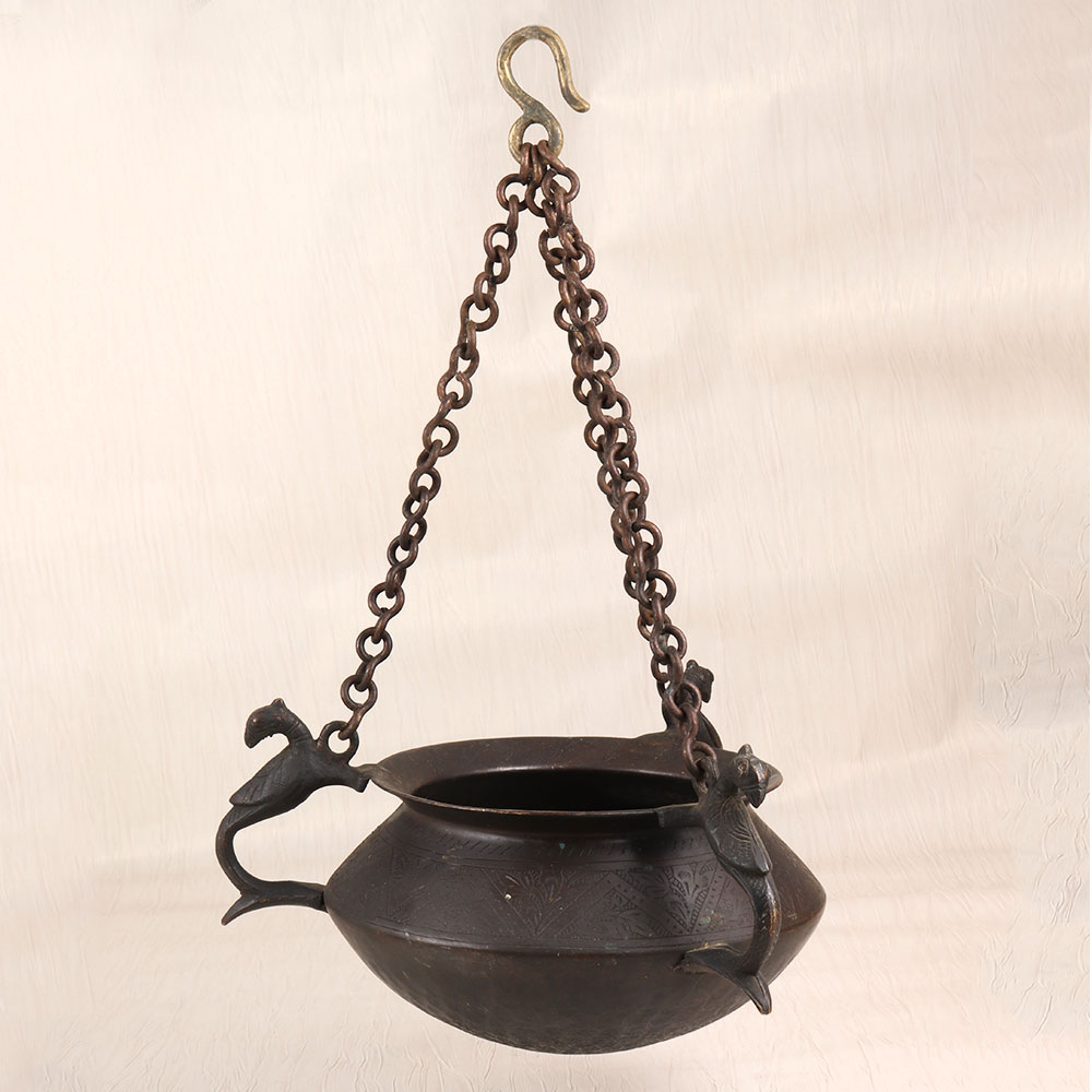 Introducing the stunning vintage brass hanging pot - a timeless piece that will transform any room into a haven of refined style. Crafted with meticulous attention to detail, this pot features a captivating peacock carving and intricate engraving, all finished in a rich, dark hue that exudes old-world charm. Bring the beauty of the past into your present-day sanctuary. This vintage brass hanging pot is more than just a functional piece - it's a work of art that will elevate your decor and leave a lasting impression on all who enter your home. Whether you're looking to add a touch of sophistication to your living room, bedroom, or office, this stunning pot will seamlessly blend with your existing aesthetic and infuse your space with timeless charm. Imagine the possibilities: fill it with lush greenery, fragrant flowers, or even use it as a stylish storage solution. No matter how you choose to display it, the vintage brass hanging pot will become the centerpiece of your space, sparking conversations and inspiring admiration. Invest in a piece of history that will continue to captivate for years to come.