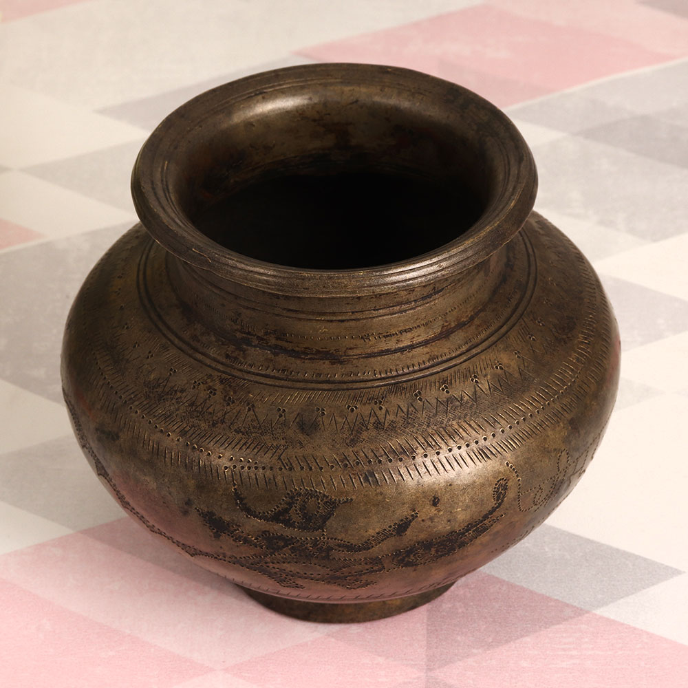 Enhance your living spaces with a touch of South Indian artistry and tradition, embodied in this Vintage Brass Holy Water Pot. Crafted by talented Indian artisans, this piece is a testament to their mastery in handcrafted metalwork. Made from high-quality brass, it features intricate engravings that reflect the rich cultural heritage of South India. The antique brown finish adds a timeless allure to this piece, making it a captivating addition to your home, office, restaurant, hotel, cafe, or shop. Not only does it serve as a stunning indoor flower pot, but it also carries profound spiritual significance. This pot is perfect for holding holy water during havans, rituals, and auspicious occasions, allowing you to partake in ancient traditions. Adding this Vintage Brass Holy Water Pot to your collection brings an aura of vintage charm, making it a captivating conversation piece. It also makes for a thoughtful and culturally rich gift for your family, friends or relatives on special, festive, or auspicious occasions.