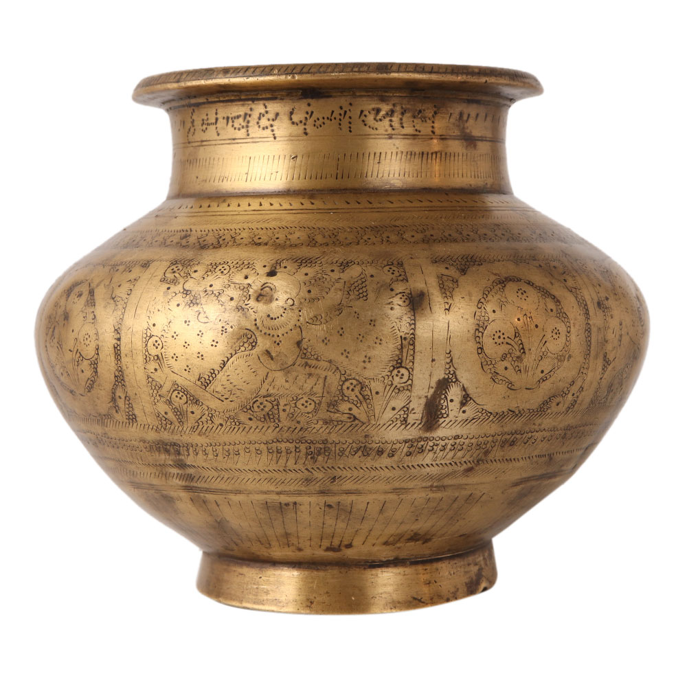 Vintage bronze water pot is engraved with a pretty dotted pattern. It has a round flat bottom to stay on the surface. It can be used as a decorative item on stages, weddings and other events.