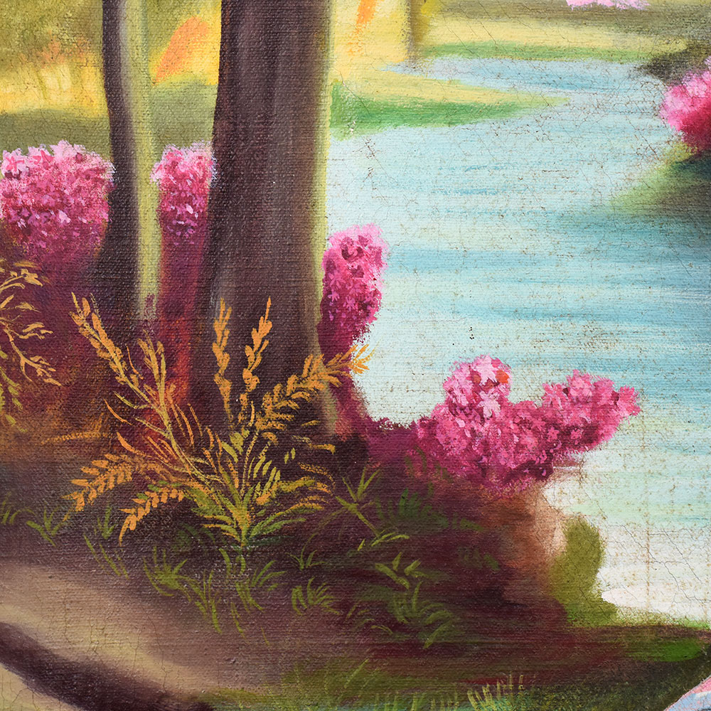- Scenic Beauty: Lush forest, river, and blooming flowers enhance the painting’s visual richness.