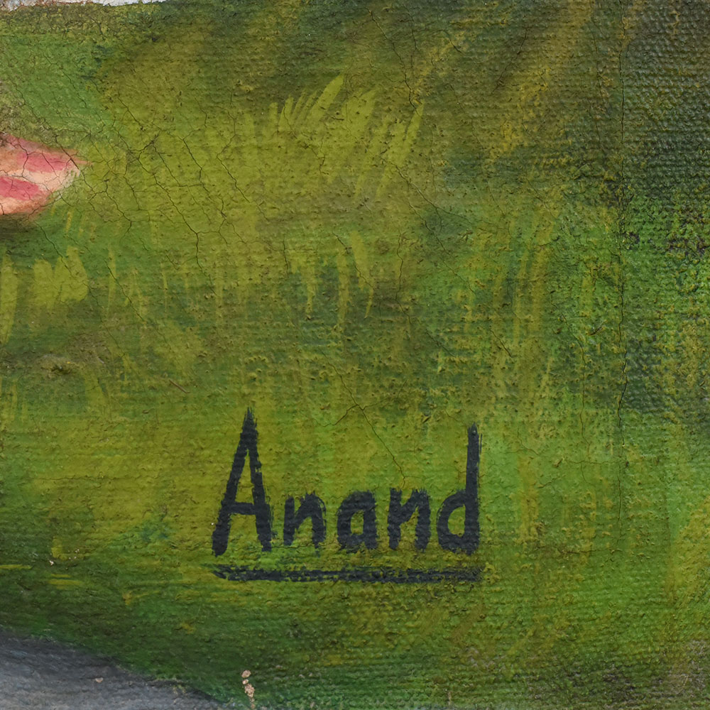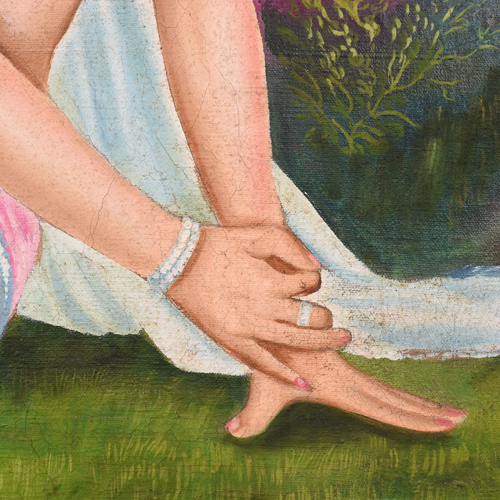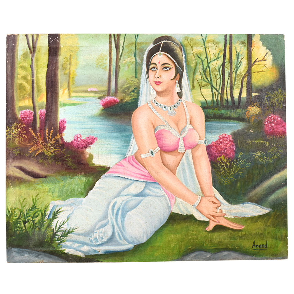 This enchanting acrylic on canvas painting portrays a graceful Indian woman seated in a serene forest landscape by a flowing river. Dressed in a delicate pink and white ensemble, adorned with sparkling jewelry and a sheer veil, she exudes beauty, poise, and calm. Her expressive eyes and elegant posture suggest a sense of longing or contemplation, adding emotional depth to the composition. The vibrant background—lush greenery, blooming flowers, and tall trees—creates a peaceful and dreamlike setting. The artist blends traditional Indian aesthetics with a romanticized natural environment, celebrating both feminine grace and the harmony of nature.