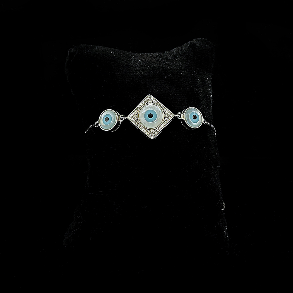 This bracelet features a square framed evil eye centerpiece crafted in 925 sterling silver. The structured geometry adds a refined character to the symbolic design, making it suitable for both casual and formal settings. Its composed layout appeals to buyers seeking timeless style with meaningful intent. Carefully finished for balanced wearability. Packed and quality checked by Indianshelf.