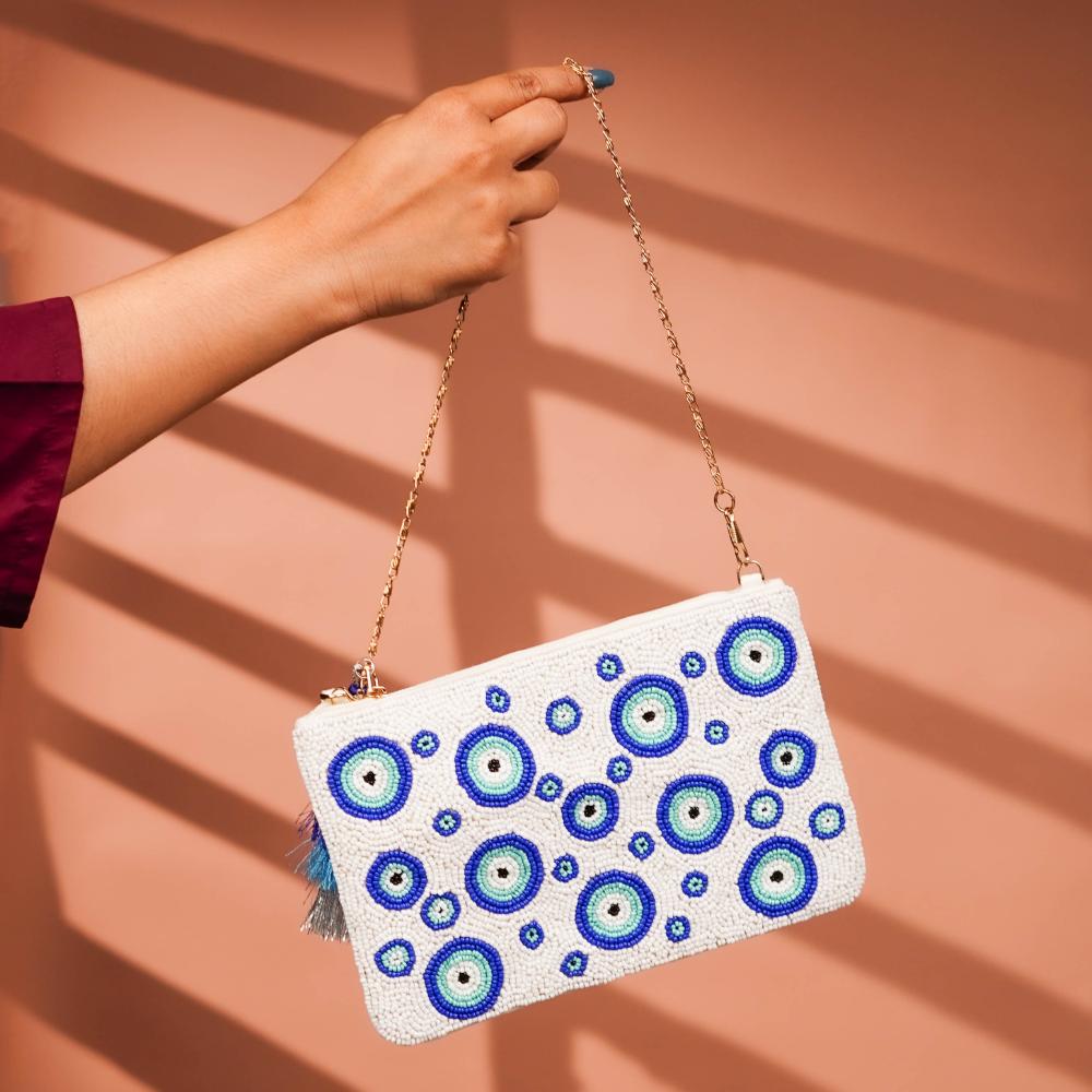 Bring a touch of boho mystique to your look with this handcrafted cotton and beads handbag. The evil-eye motif—stylized in various shades of blue—creates a visually engaging pattern on the white base. A soft ombré tassel sways with your every step, adding elegance and movement. Versatile, lightweight, and radiating charm, this bag transitions from beachwear to evening vibes effortlessly.