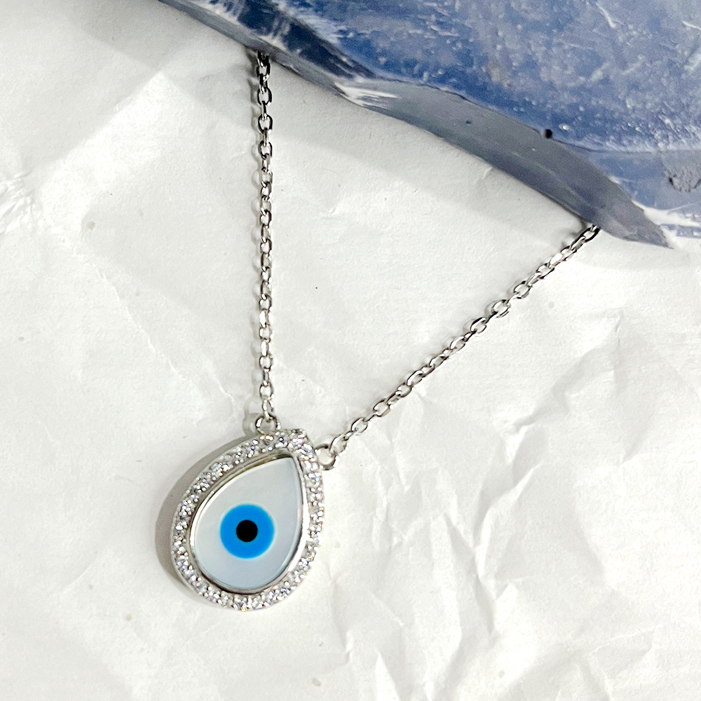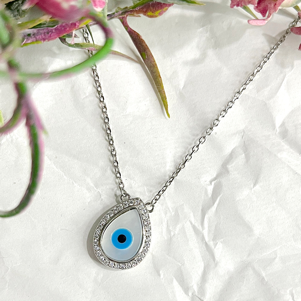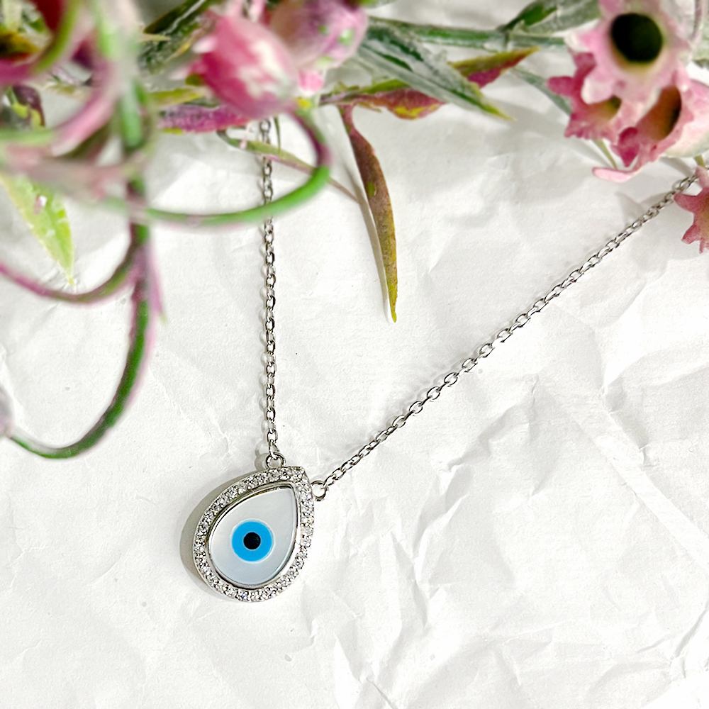 The droplet inspired silhouette frames the eye motif in a composed structure that feels refined and wearable. Hand finished detailing enhances clarity while maintaining a lightweight feel.