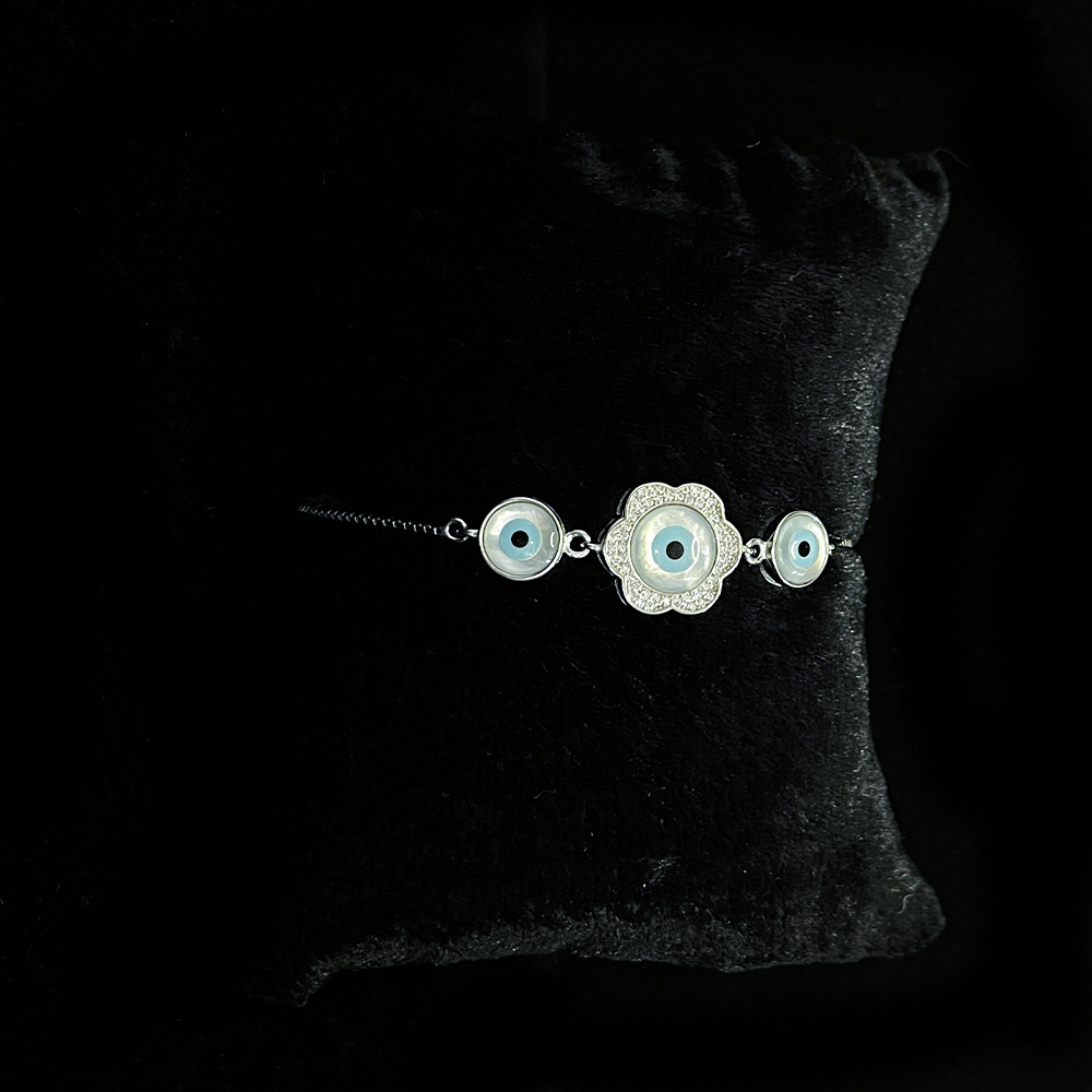 The bracelet highlights a floral shaped charm that frames the evil eye symbol, offering a composed blend of softness and symbolism. The design remains expressive without excess detail, making it suitable for regular styling and curated jewelry selections.