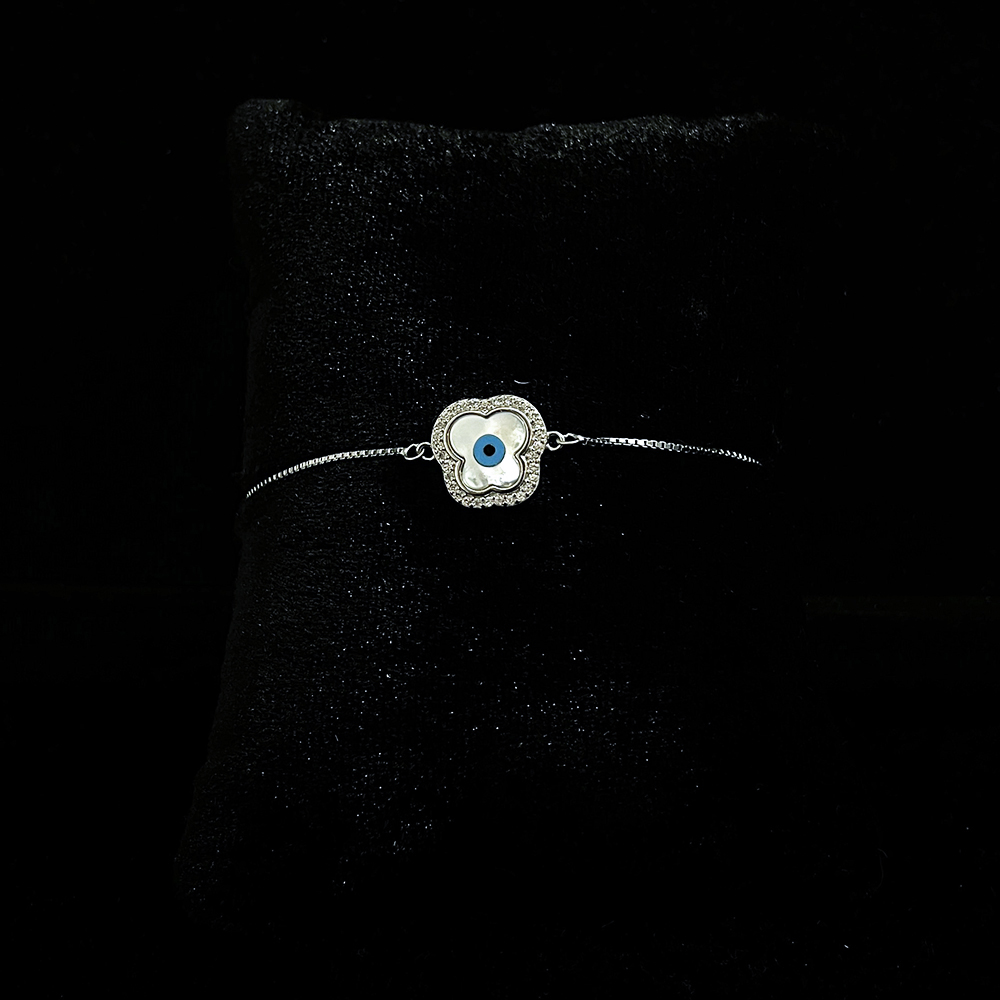 This minimal bracelet features a refined evil eye floral charm crafted in 925 sterling silver. Designed with a light and balanced form, it reflects subtle symbolism tied to protection and positive intent. The clean structure makes it suitable for daily wear while appealing to buyers who prefer understated meaningful jewelry. Carefully finished for comfort and longevity. Packed and quality checked by Indianshelf.