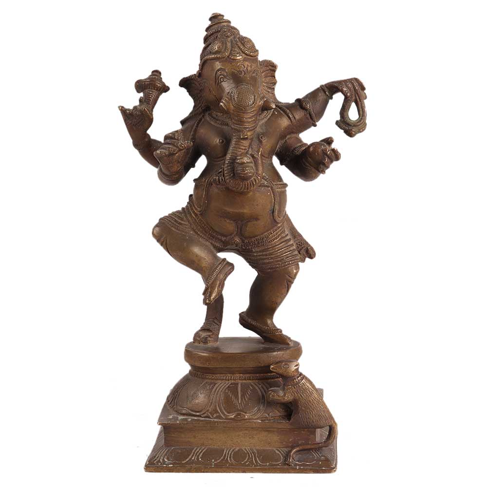 Place this rare Dancing Ganesha Brass Idol on any table unit to enhance its appearance. This elegant centerpiece depicts Lord Ganesha in a dancing posture. The fine details of Lord Ganesha's ornaments and mukut add to the charm of this idol. This is also an excellent stylish item for your home. Excellent gift for traditional occasions such as housewarmings and other traditional functions. The dancing Ganesha idol will look great on your shelf and serve as an excellent decorative item. You can also give it to your loved ones at house warming party parties and other traditional functions.