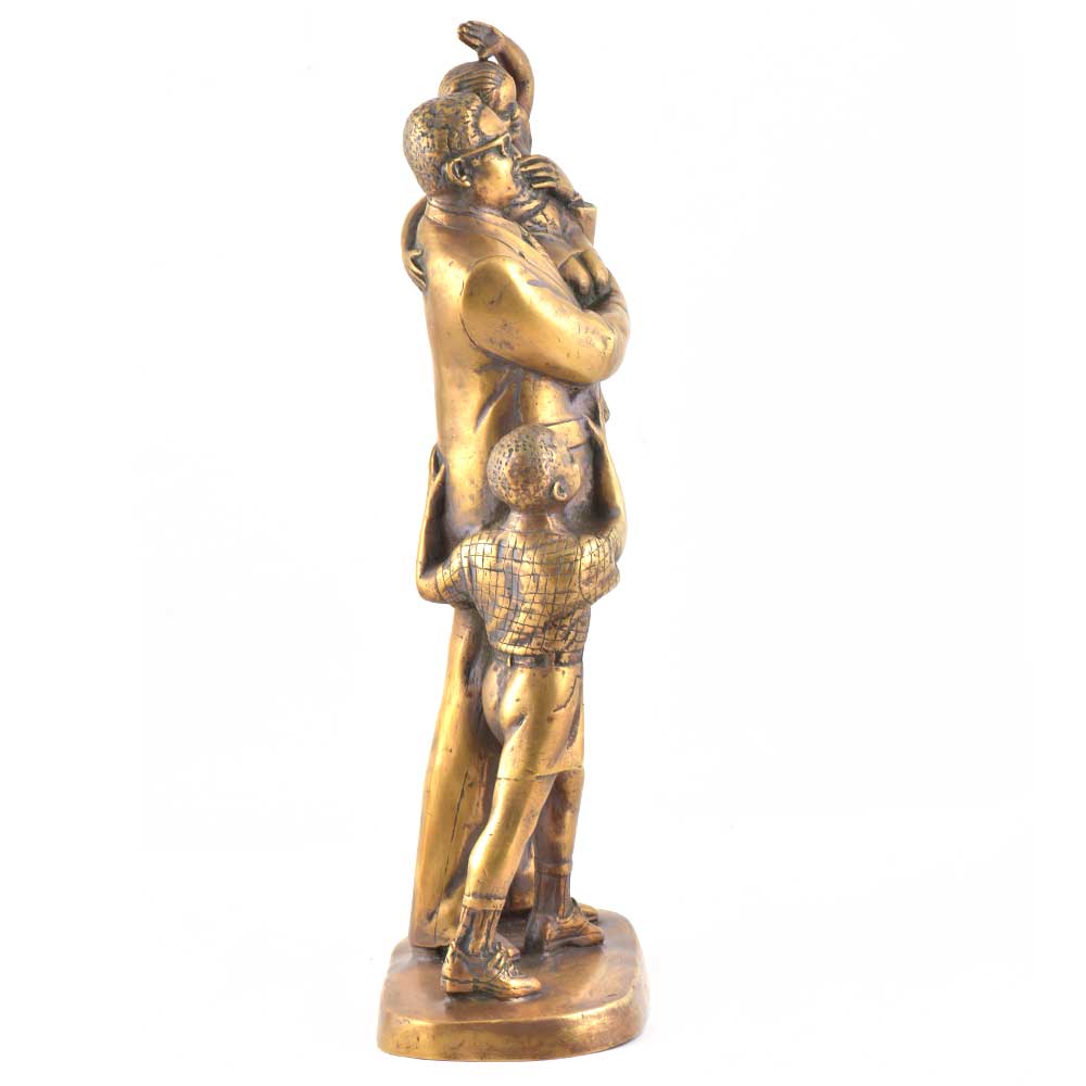A lovely looking handmade brass statue of a father with his two children one in his lap and the other hugging him tightly. The father is properly dressed in a suit wearing glasses . A lovely gifting option on fathers day or for friends and relatives where the concept of joint family and close knit family is still prevalent.