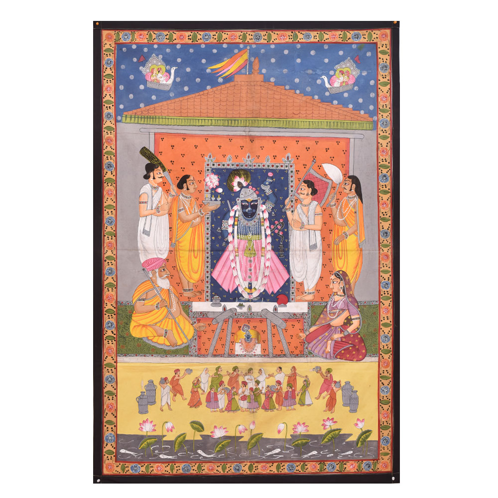 The pichwai painting on fabric cloth is an exquisite depiction of Hindu God, surrounded by saints and devotees, being worshipped at a temple. The intricate painting is a testament to the incredible skills of the professional Indian artists who have captured every detail of the scene with multi-coloured paints. The painting is bordered by beautiful floral designs in vibrant colours that add a sense of vibrancy and energy to the composition. The painting also features two swans, the vehicle of the Hindu God, flying in the sky with two passengers each, adding a touch of whimsy and mystical charm to the piece. This stunning work of art is a perfect addition to any prayer room or temple, creating an atmosphere of devotion and spirituality. It also makes for a truly auspicious gift for family, friends or relatives on special occasions, such as weddings, birthdays, or other festive celebrations. Overall, this pichwai painting is a visual feast for the eyes and a wonderful way to celebrate the divine in all its beauty and glory.