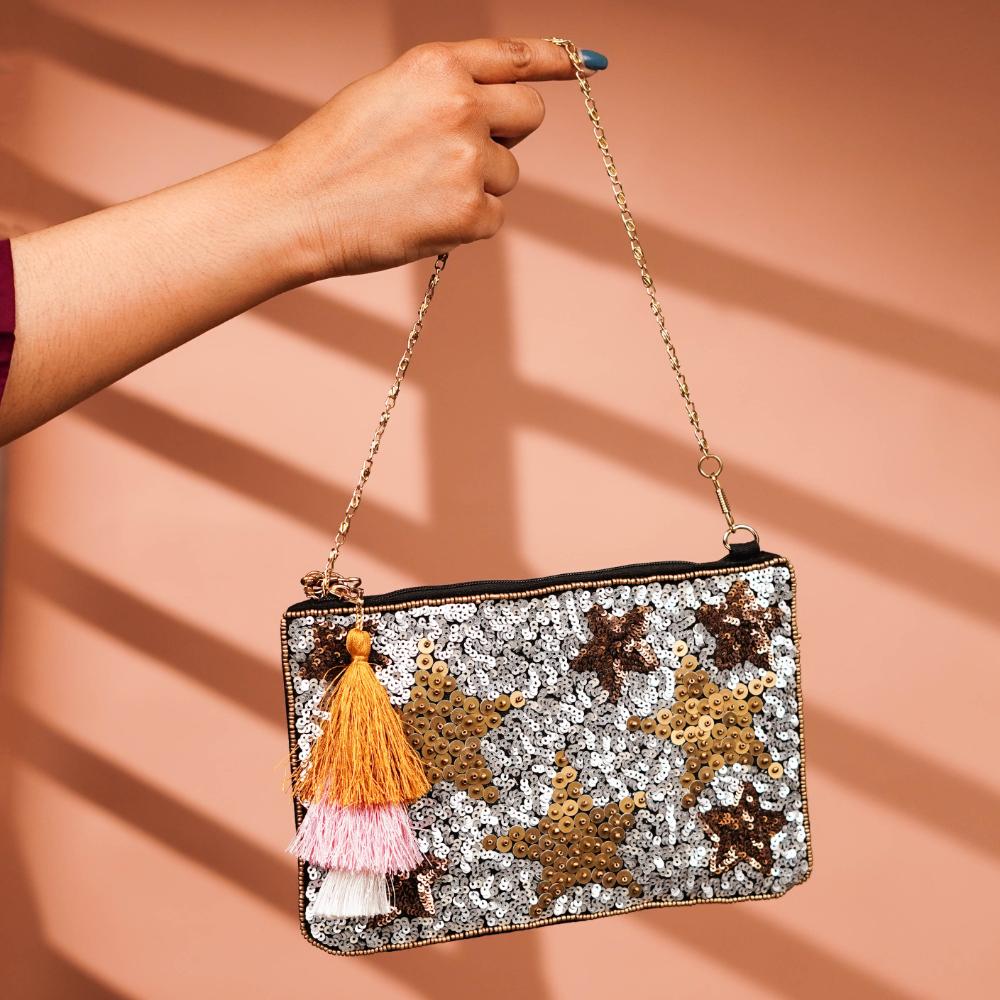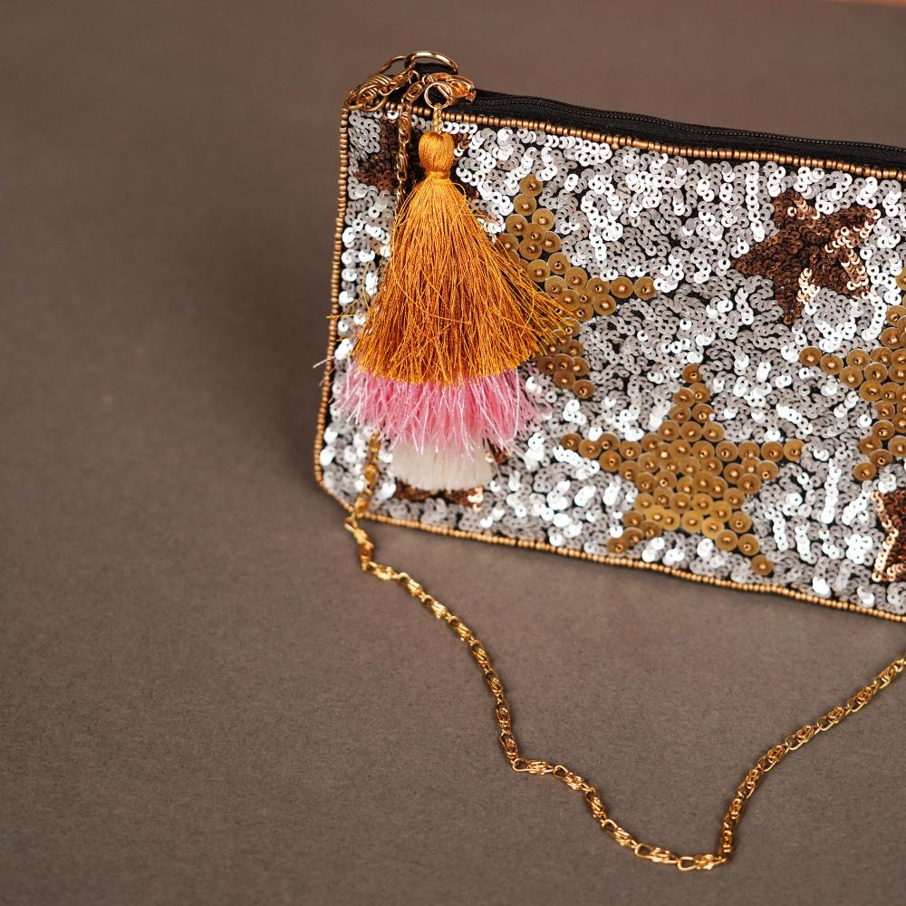 This cotton and beads handbag redefines festive glamour with a playful twist. Designed with a metallic silver base adorned with twinkling star motifs in gold and bronze, it glimmers with personality. A standout tassel in mustard, blush pink, and white adds color and texture. Lightweight and easy to carry with its delicate chain, this bag is your go-to for both celebration and statement.