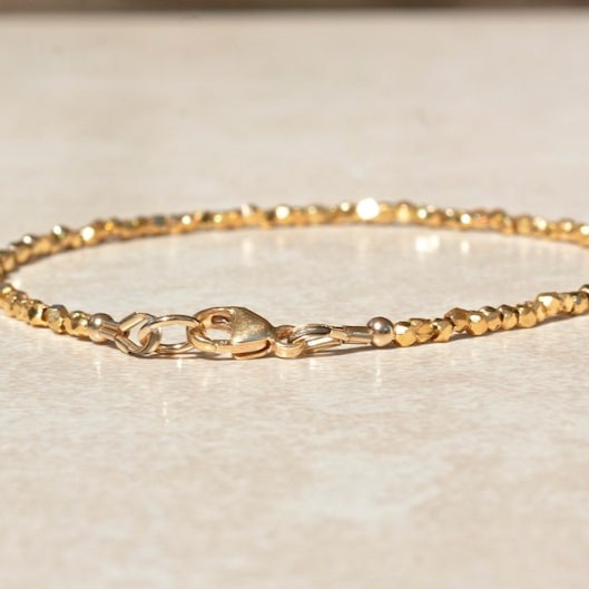 This Faceted Metal Beaded Bracelet blends minimalist elegance with handcrafted brilliance. Made from premium brass and finished with a radiant 22K gold plating, each bead is intricately faceted to catch and reflect light beautifully. Designed at 6.5 inches, this bracelet offers a sleek, modern look that feels both delicate and luxurious—perfect for women who love subtle sparkle and artisan-made jewelry.