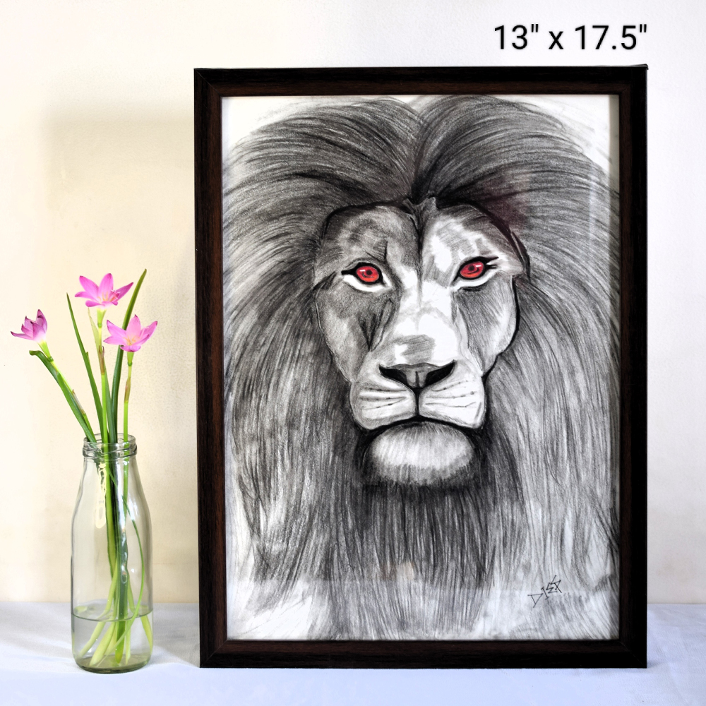 This intense and commanding pencil sketch captures the raw power and regal presence of a lion with piercing red eyes. Titled “Fierce Lion,” the artwork showcases masterful shading and detail in the lion’s mane, face, and expression, creating a lifelike yet stylized portrayal of strength and dominance. The bold use of monochrome with a touch of red in the eyes enhances the animal’s majestic and intimidating aura. Perfect for bold interiors, offices, or anyone inspired by the spirit of the wild.