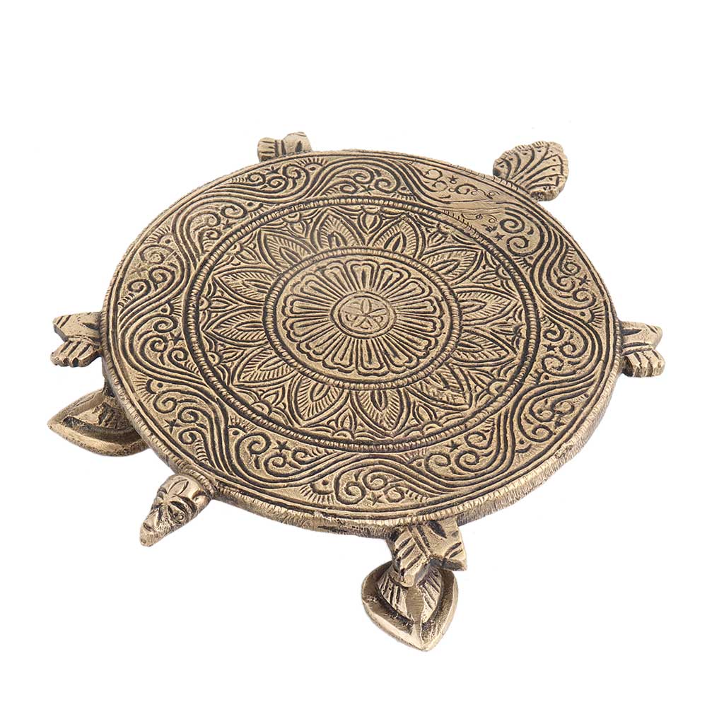 This brass is an example of fine craftsmanship made in superior quality brass metal table with some lovely floral carving on top and many legs. Religious gift , feng shui gift, Christmas gift , house warming gift, used in pooja ghar, in religious places or in your home interiors.