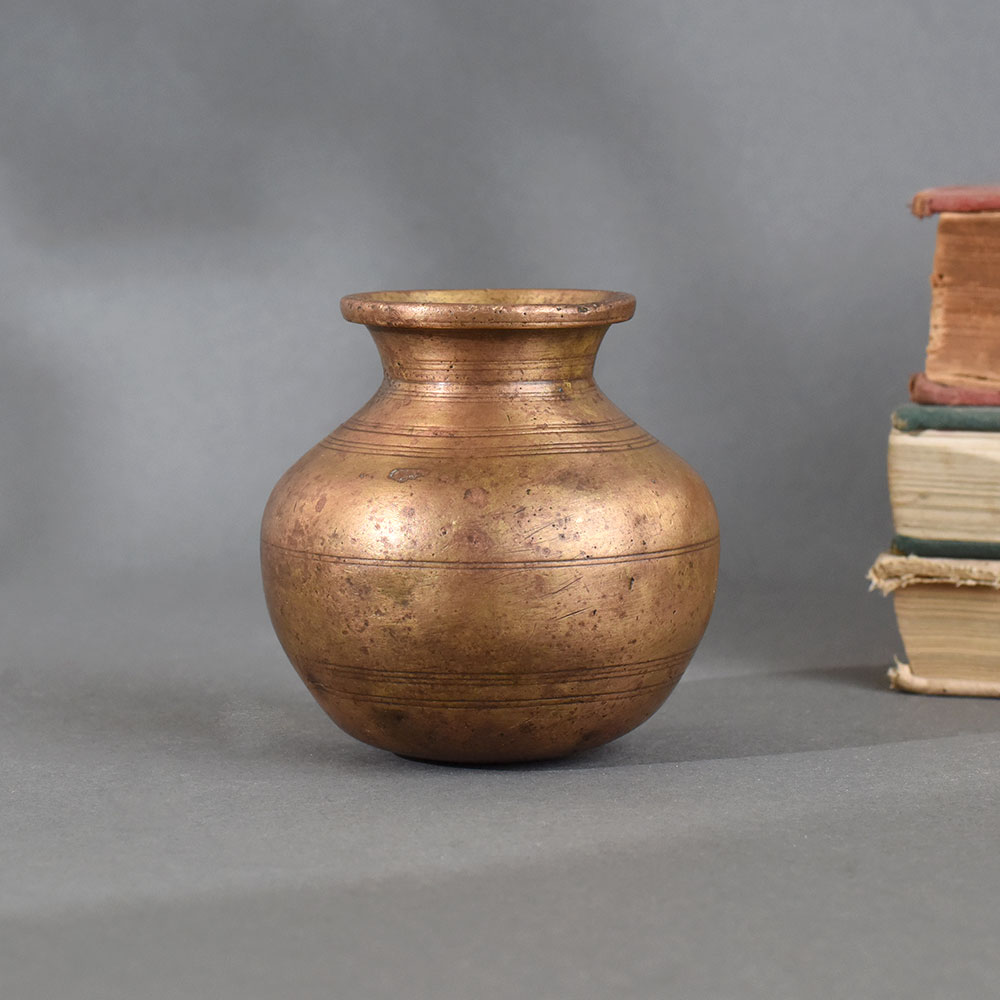This antique brass holy water pot is a beautifully handcrafted piece inspired by traditional Indian design. Its rounded shape and subtle engraved lines reflect cultural heritage and artisanal skill. Perfect for use in rituals, poojas, and temple ceremonies, this pot also serves as a vintage decorative accent for your home. The solid brass construction ensures durability and a timeless golden finish that adds elegance to any sacred space. A meaningful addition to your spiritual collection or a thoughtful gift for religious occasions.