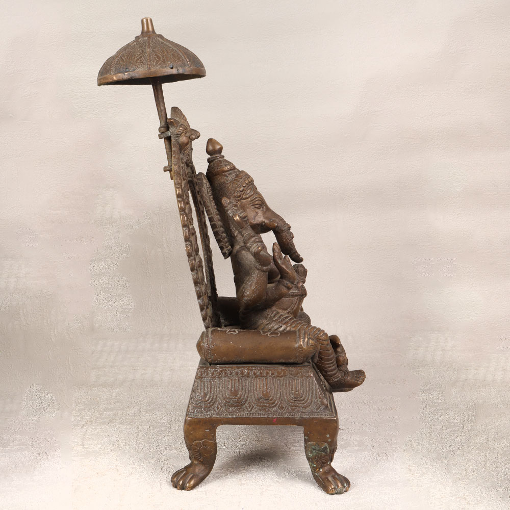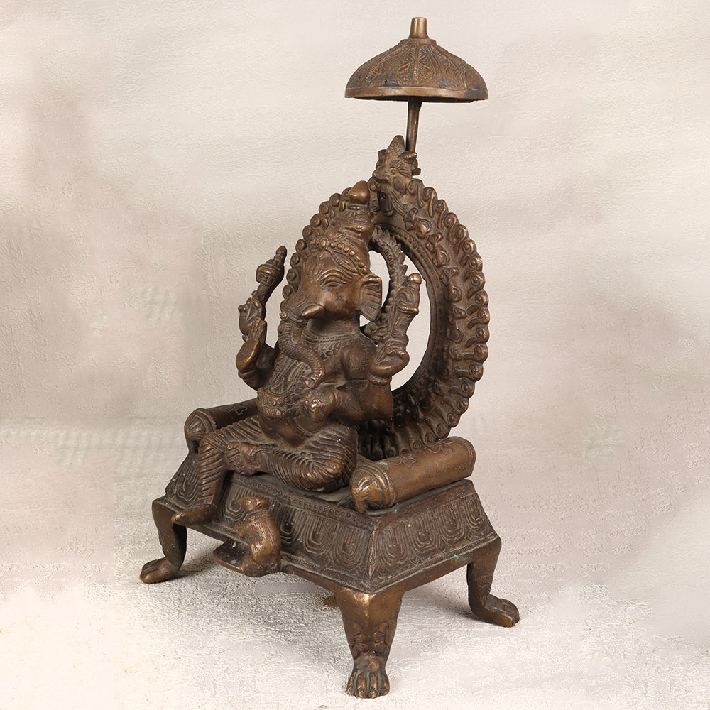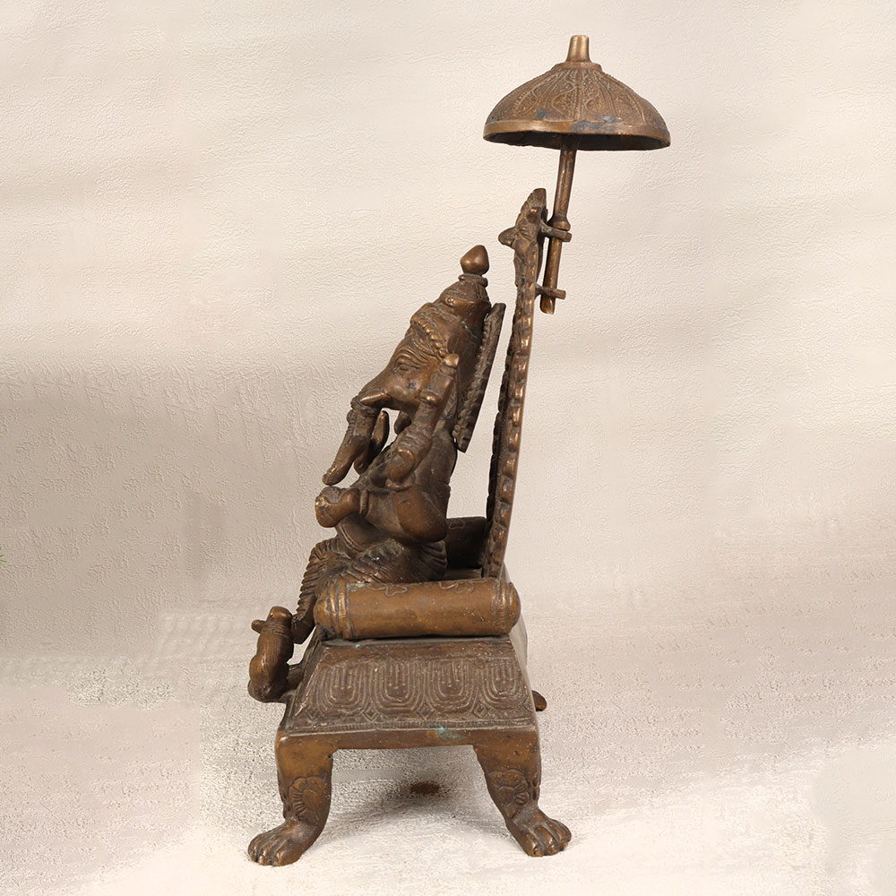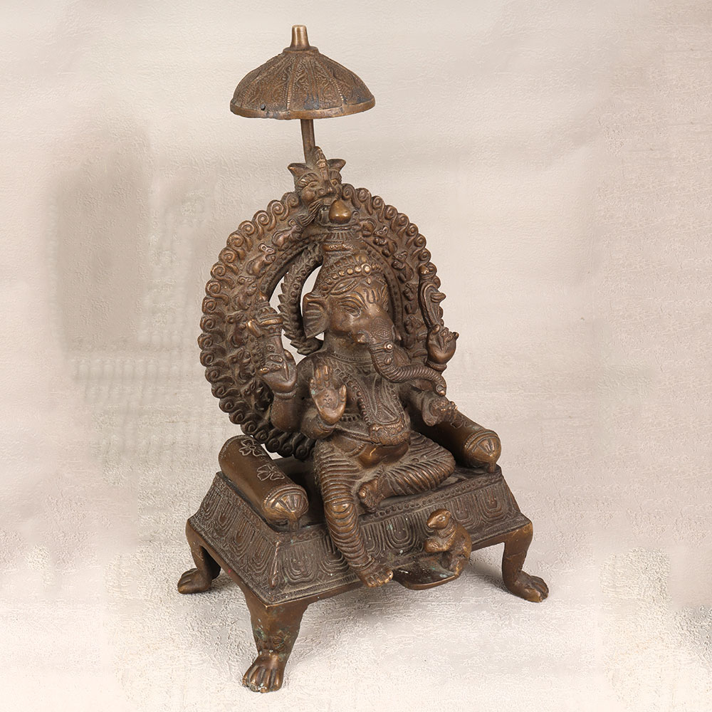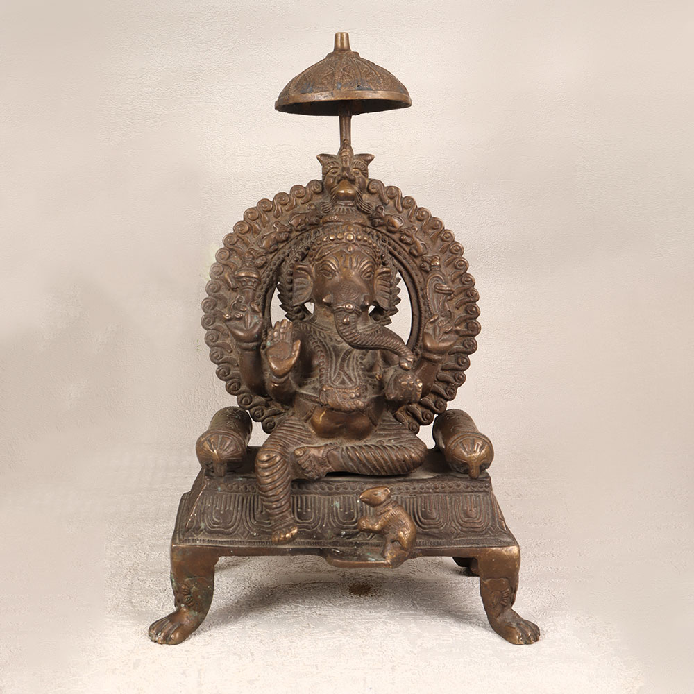 Enhance your space with the divine presence of this brass statue depicting Lord Ganesha, intricately crafted by talented Indian artisans. Seated regally on a majestic throne, the serene countenance of Lord Ganesha radiates tranquillity and wisdom. His vahana, Mushak, faithfully accompanies him, adding a touch of whimsy to the composition. Meticulously handcrafted from high-quality brass, the statue boasts an antique brown finish that imparts a timeless allure. The craftsmanship reflects the rich heritage of Indian artistry, capturing the essence of spirituality with remarkable detail. This resplendent creation is versatile, making it a perfect addition to your home, office, restaurant, hotel, or cafe prayer room. Beyond its aesthetic appeal, this brass masterpiece doubles as a unique vintage collectible, enriching any space with cultural significance. Embrace the tradition and symbolism embodied in Lord Ganesha, the remover of obstacles, by making this statue a focal point of your decor. Its enduring beauty also makes it a thoughtful and meaningful gift for your family, friends or relatives on special, festive, or auspicious occasions.
