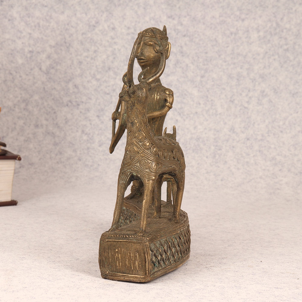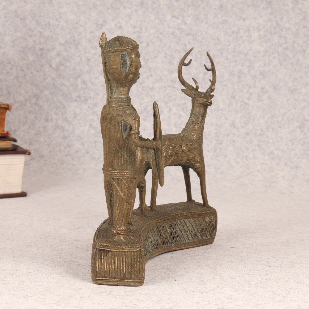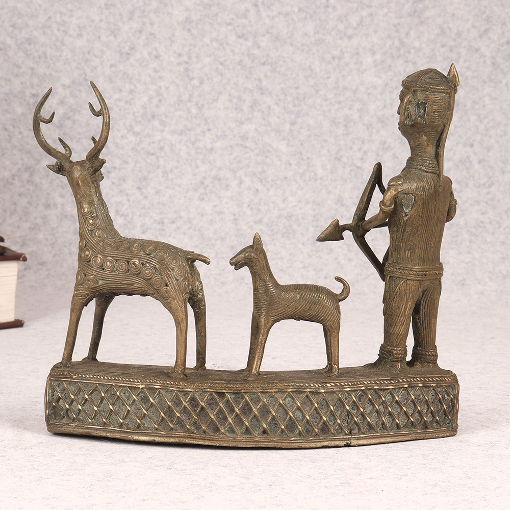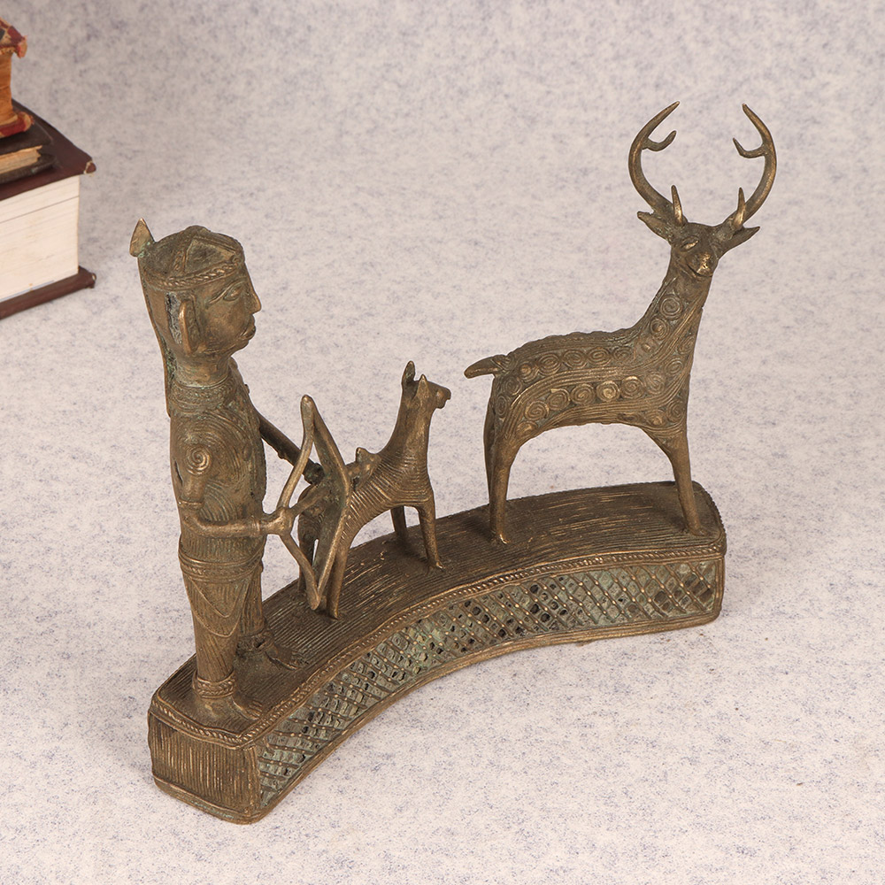 Discover the raw energy of the chase with this exquisite brass statue, a stunning work of tribal art that captures the timeless traditions of our ancestors. Poised with bow and arrow, the stoic figure stands resolute, his loyal hound at his side and a mighty stag in his sights. Crafted with meticulous attention to detail, this piece invites you to connect with the primal power that lies at the heart of the human experience. Lose yourself in the tranquil focus of the hunter, his gaze fixed on the prize. Feel the anticipation build as you envision the arrow taking flight, the thunderous hooves of the stag, the bated breath of the chase. This brass statue is more than a mere decoration - it's a portal to a bygone era, a touchstone to the raw power that lies at the heart of the human experience. Whether you're a seasoned outdoorsman or simply someone who appreciates the beauty of tribal art, this stunning brass figure will captivate and inspire. Bring home this masterpiece and let the spirit of the hunt ignite your soul, transforming your living space into a celebration of our ancestral roots.