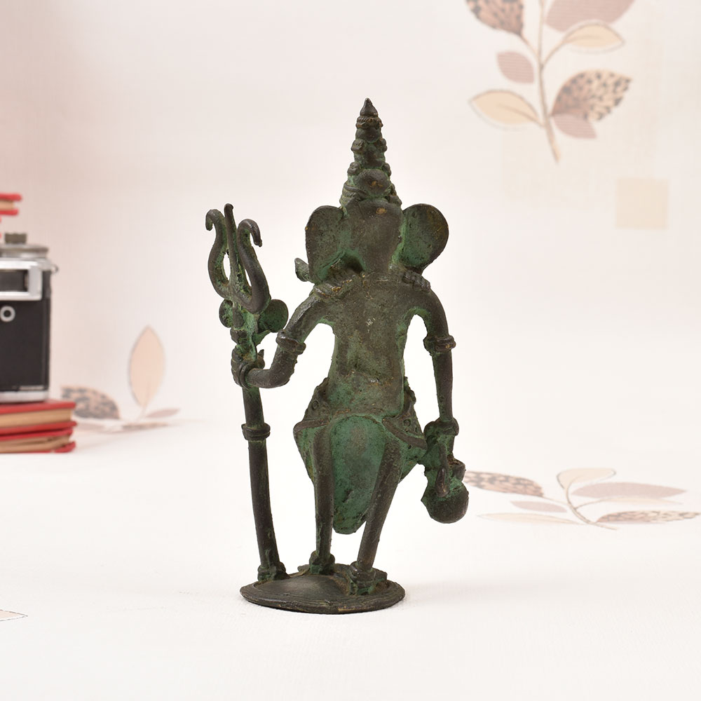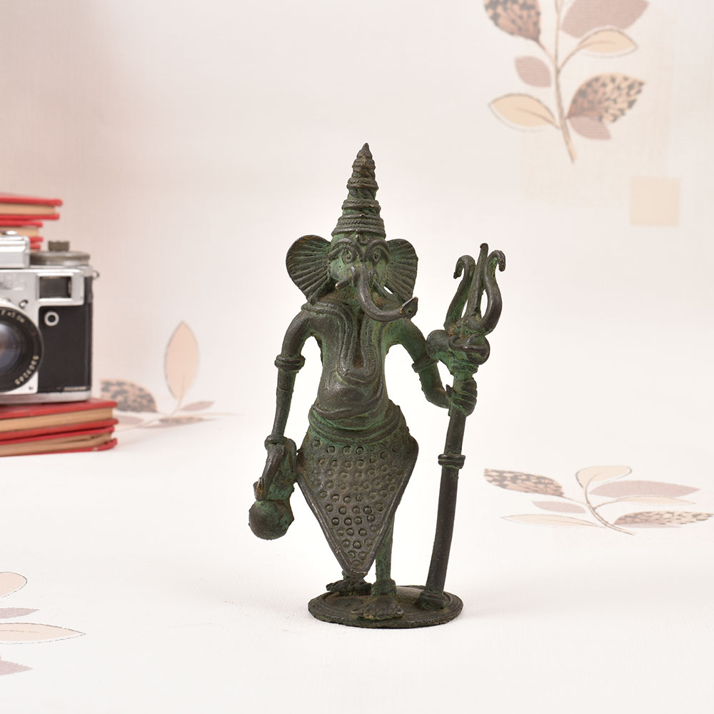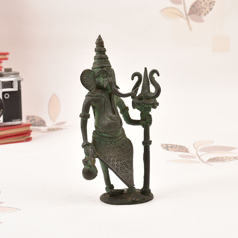- Depicts Lord Ganesha in a classic standing pose, holding the sacred Trident and Kamandal